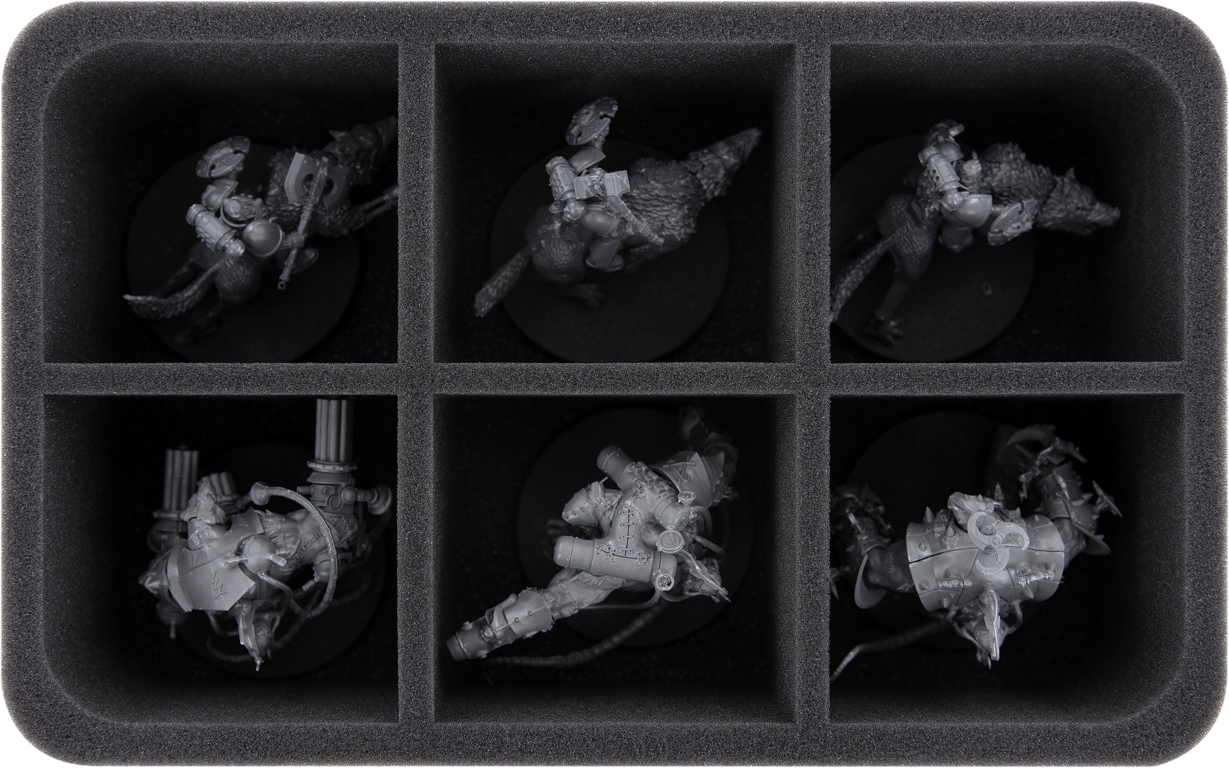 Up to 6 miniatures of the Space Marines find a safe place in this Half-Size foam tray. The different sized compartments are ideal for keeping larger or bulkier models of your army clearly arranged and well protected.