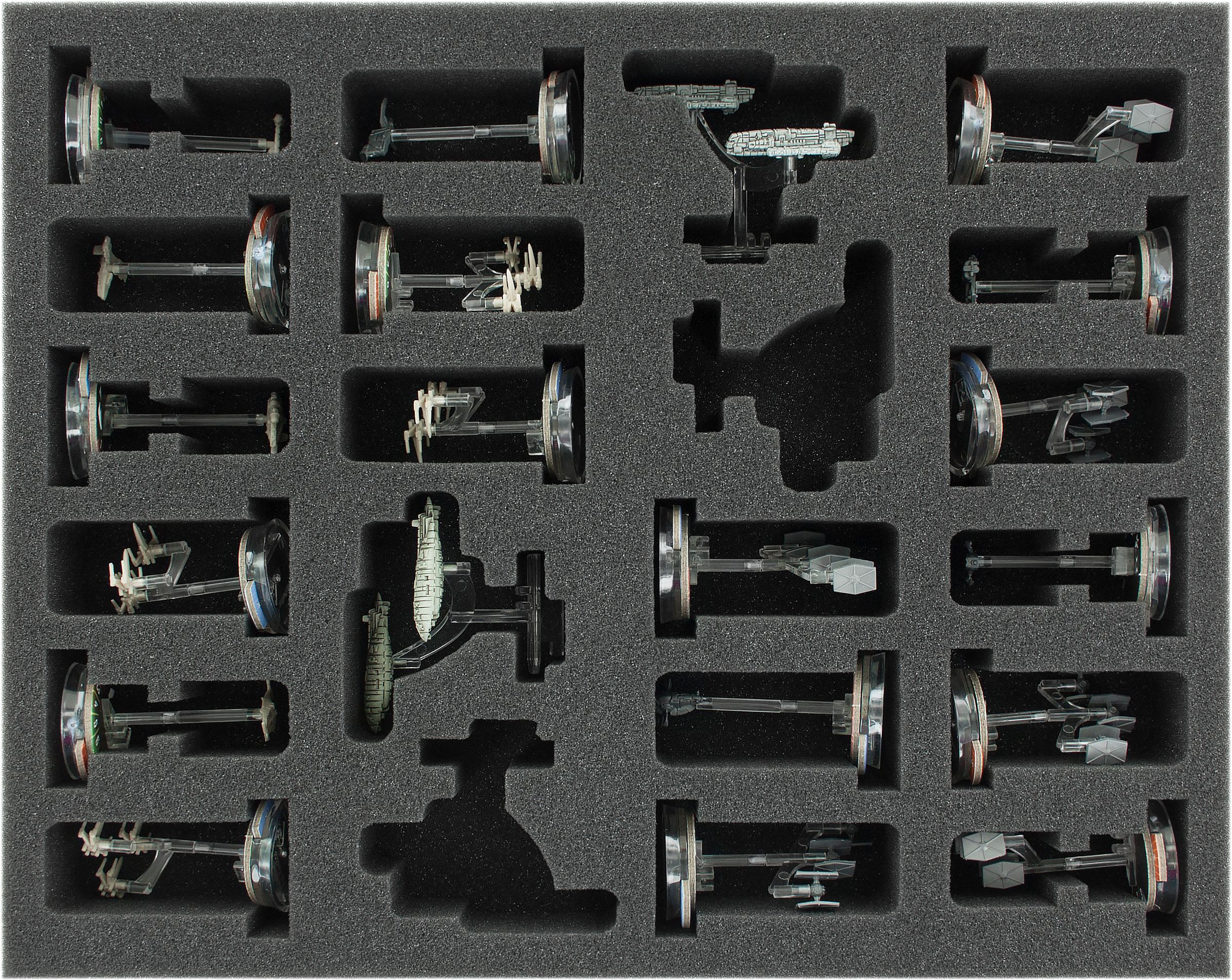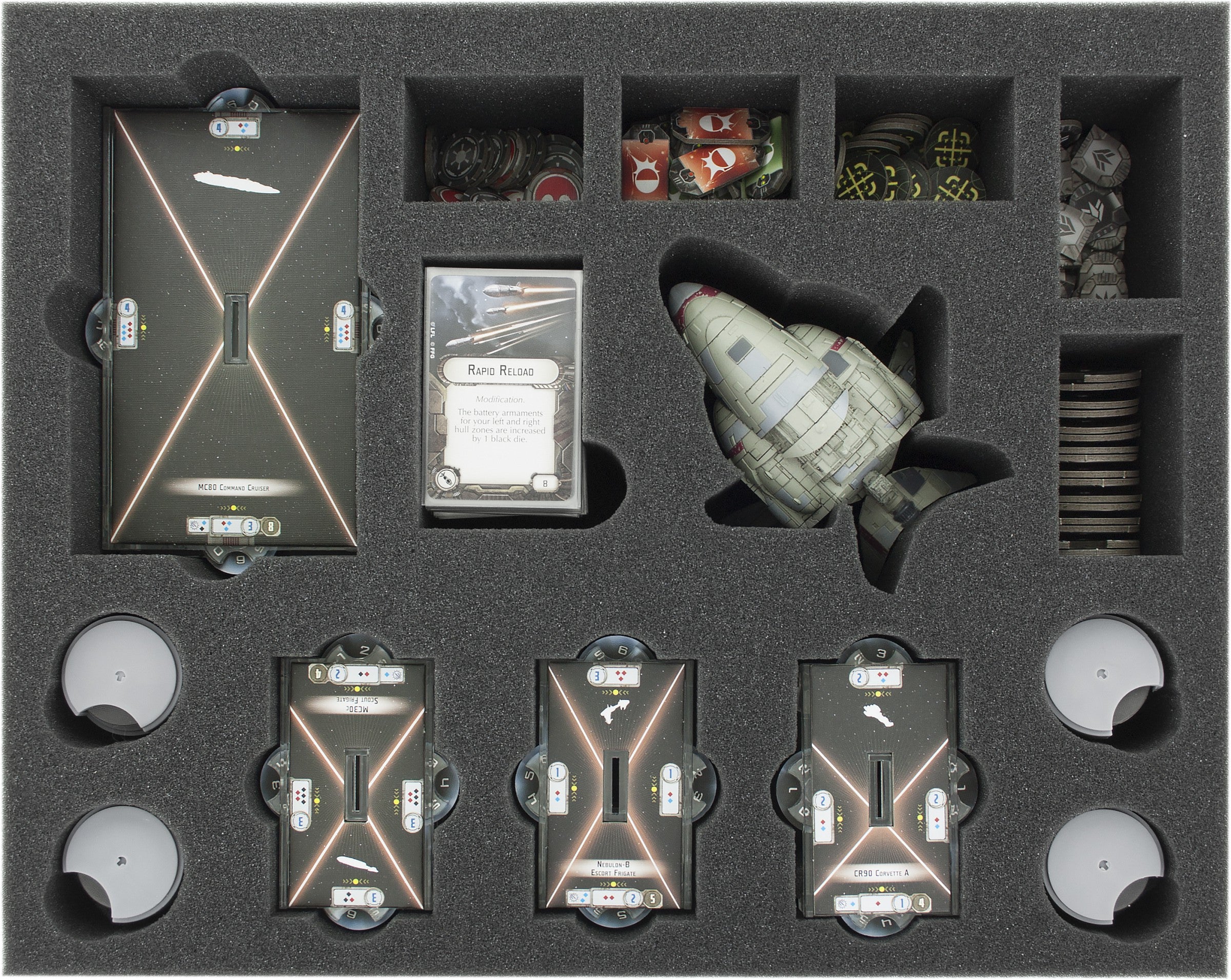• 1 foam tray with 12 compartments for 2 2 MC80 Assault Carrier and/or MC80 Battle Cruiser, 1 Nebulon-B Escort Frigate, 1 Nebulon-B Support Refit, 1 Phoenix Home, 1 MC30c-Torpedo Frigate or MC30c Scout Frigate, 2 Hammerhead-Corvettes, bases, speed- and command dials (FSKS045BO)