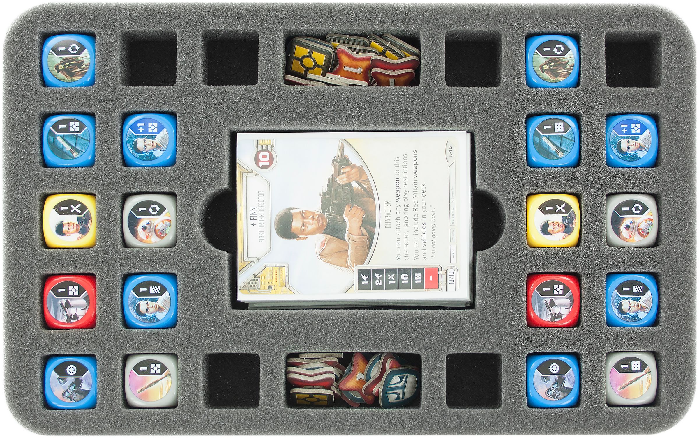 When the dice roll, they hopefully roll on the table and not out of your bag. The Feldherr storage box FSLB040 with the matching foam trays for Star Wars Destiny accessories allows you to properly sort and safely store your dice, (sleeved) cards and tokens.