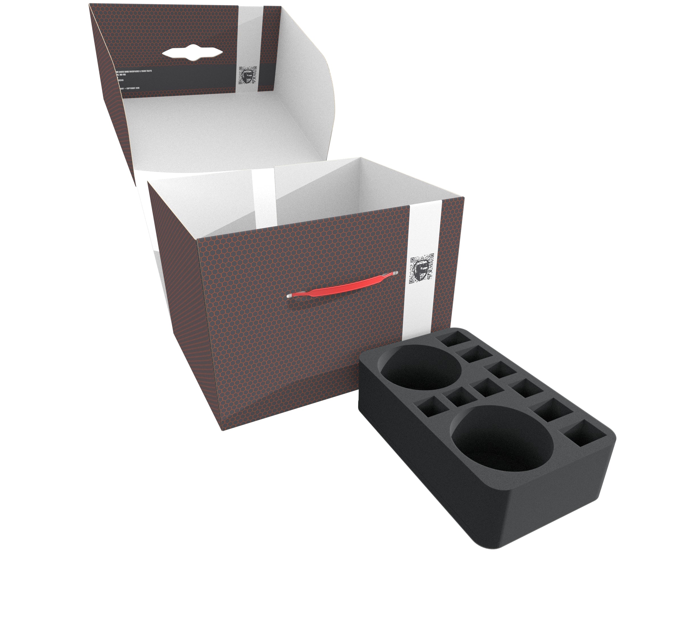 The Storage Box FSLB250 is made of coated, double-walled cardboard. This makes it not only pleasantly light, but also particularly tear-resistant and stable. With the matching foam trays, miniatures and game material can be stored safely and dust-protected and can also be transported effortlessly with the plastic carrying handle. To make it easier to store and remove the foam mats, one side of the box can be opened completely. The trays are either inserted from above or simply slided into the box from the side.