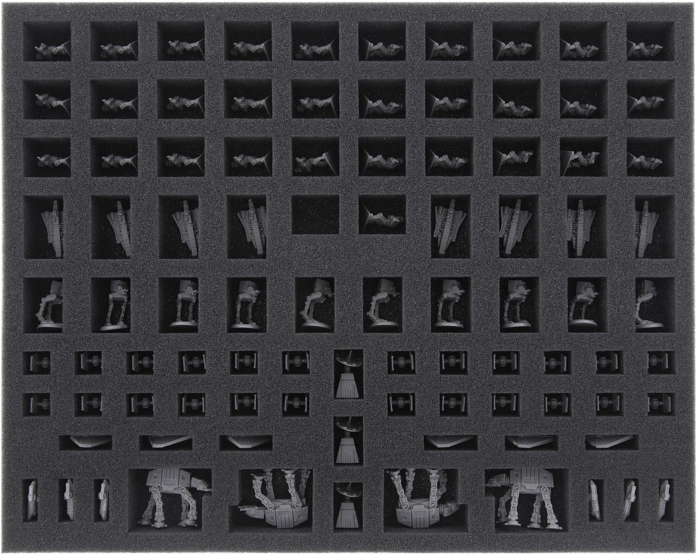This foam tray features 97 custom cut compartments which will safely hold your Empire miniatures from the Star Wars Rebellion / Rise of the Empire universe.