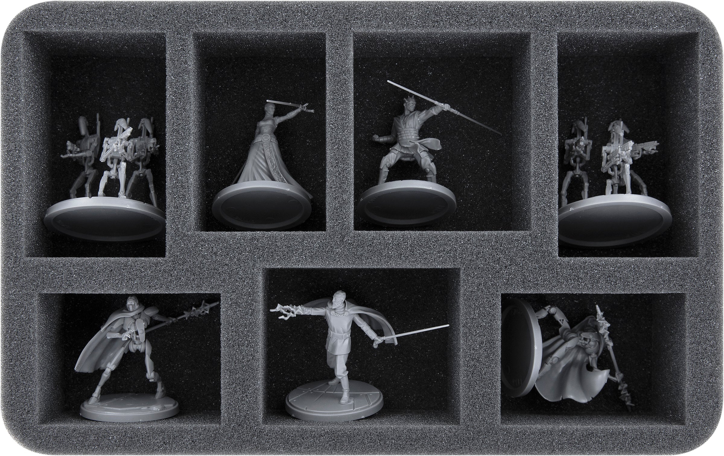 The foam tray offers space for larger miniatures on bases up to 50 mm, so they have enough free space. Divided into seven compartments, the tray is suitable for safely storing figures like Lord Maul, Count Dooku, Asajj Ventress and miniatures with similar dimension.