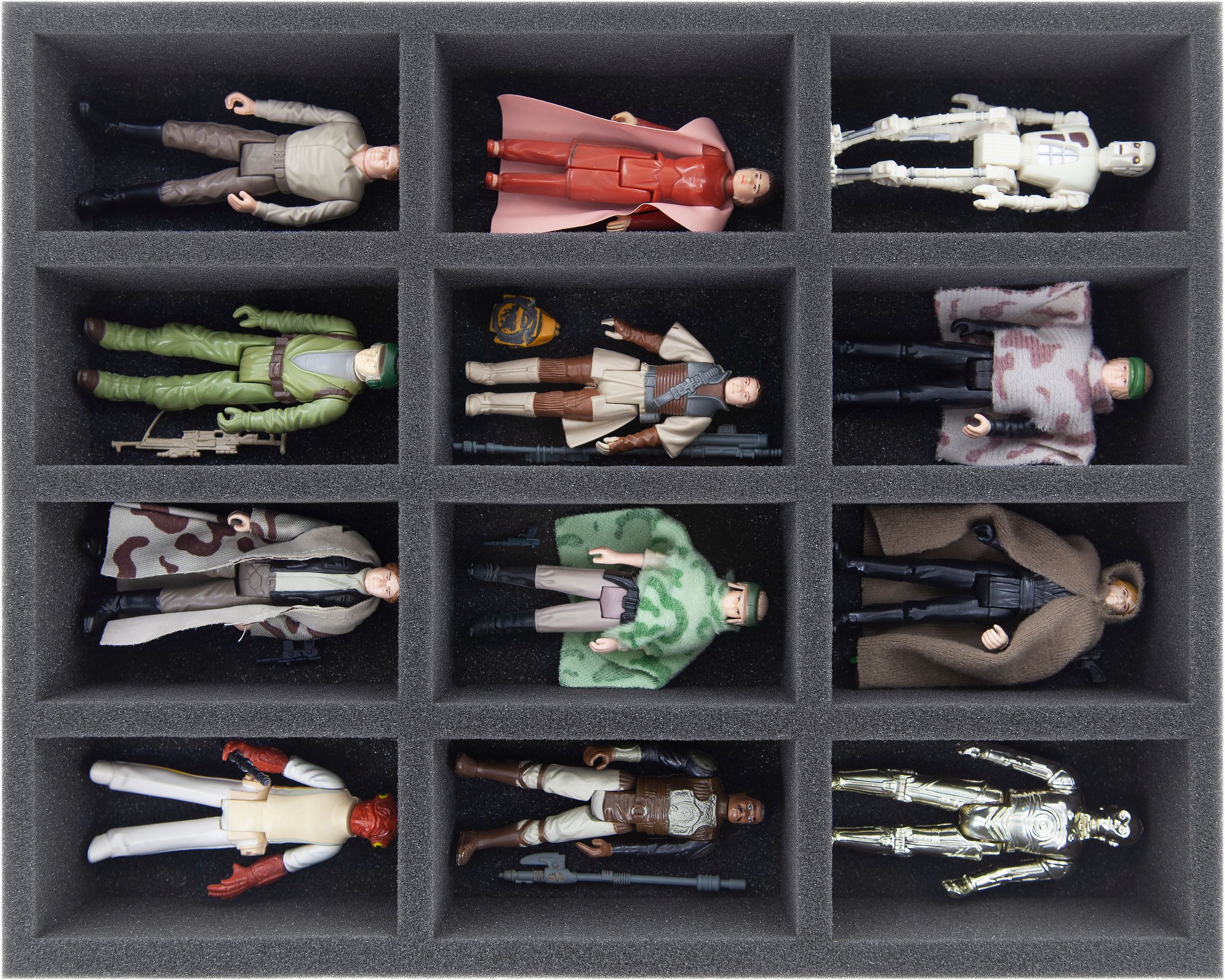 The foam trays is divided into same-sized 12 compartments. It is ideal for the safe storage of medium-sized miniatures (3.75 inch) like e. g. Stormtroopers or Luke Skywalker. The fine-pored foam provides ultimate protection against damage – fragile parts stay intact, surfaces don't get scratched.
