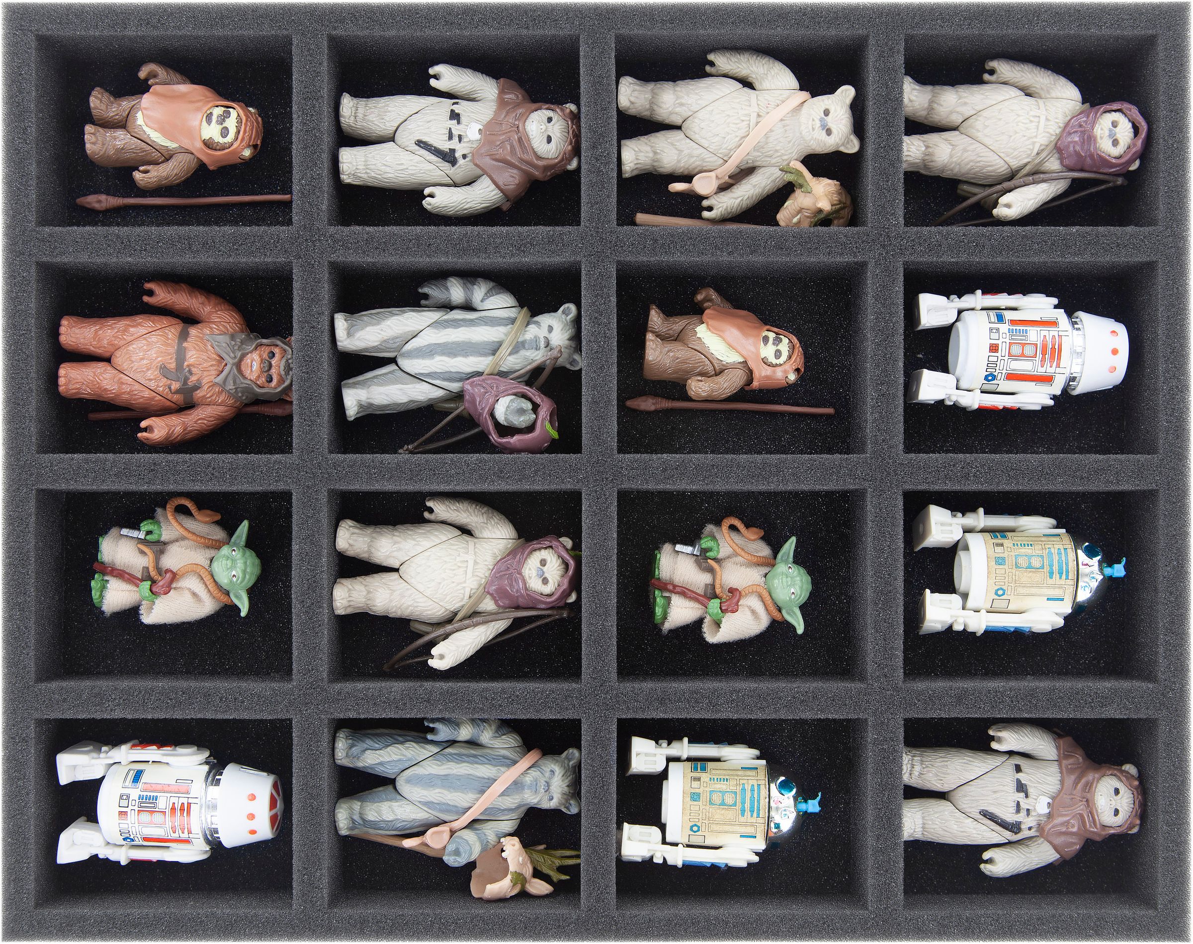 The two foam trays with the 12 compartments each are ideal for the safe storage of medium-sized miniatures (3.75 inch) like e. g. Stormtroopers or Luke Skywalker. The fine-pored foam provides ultimate protection against damage – fragile parts stay intact, surfaces don't get scratched.