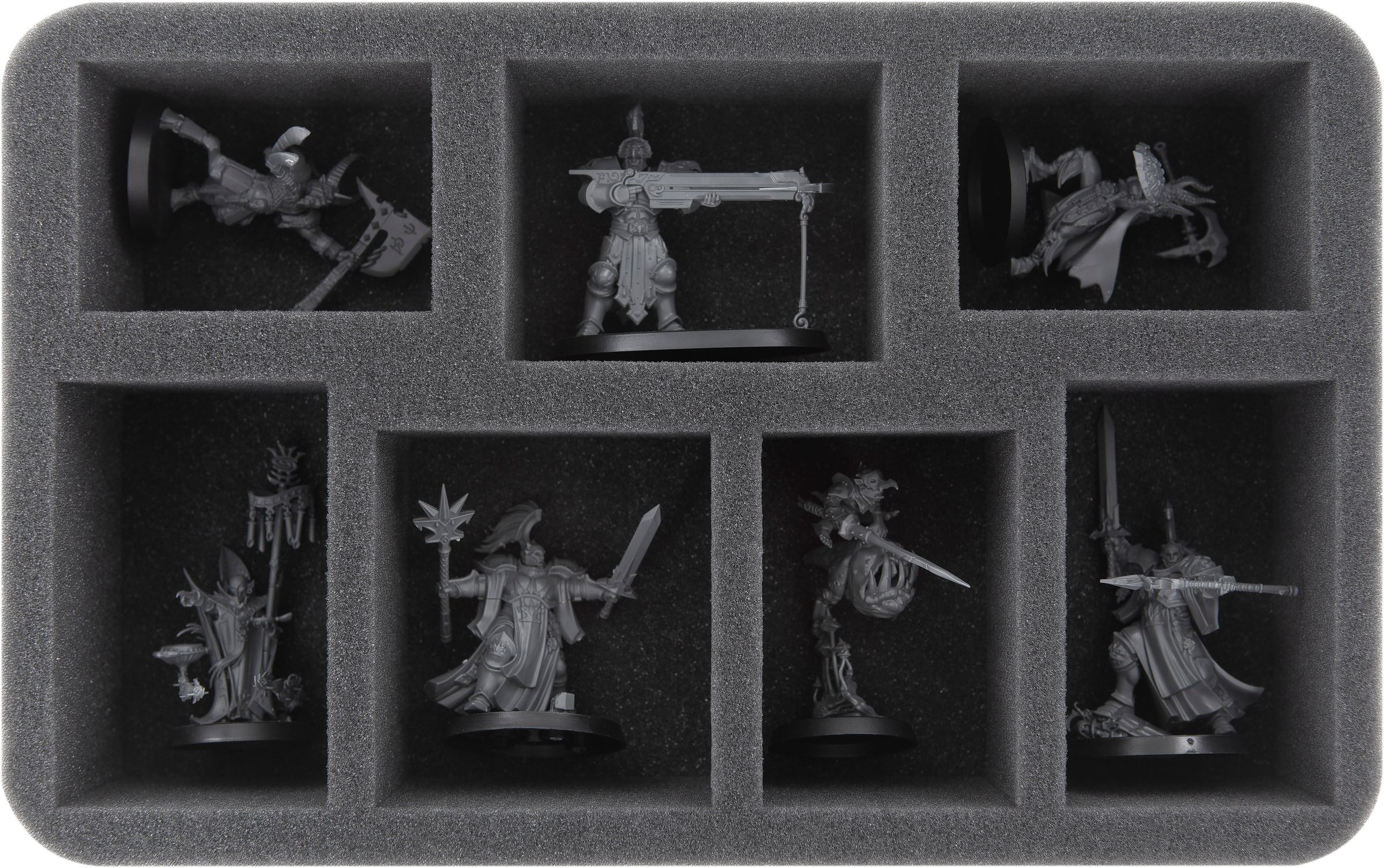 The insert FSMEKU070BO features six compartments and provides space for large miniatures like e. g. Mounted warriors on 90 mm x 52 mm oval bases (e. g. Vandus Hammerhand, the Concussors or the Evocators on Celestial Dracolines).