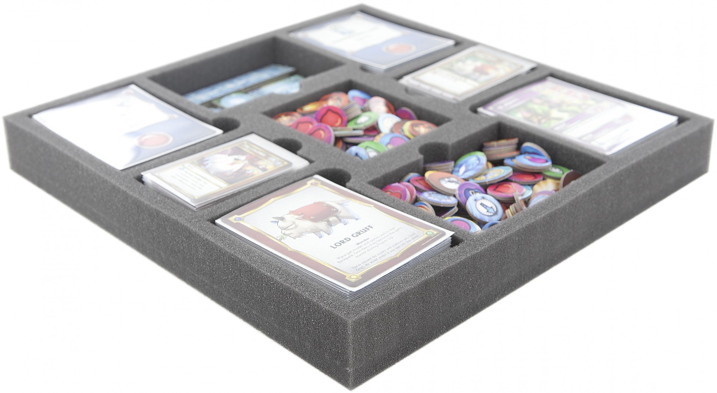 Foam tray especially for Super Dungeon Explore - Forgotten King. The 9 different sized compartments are tokens and cards in sleeves.