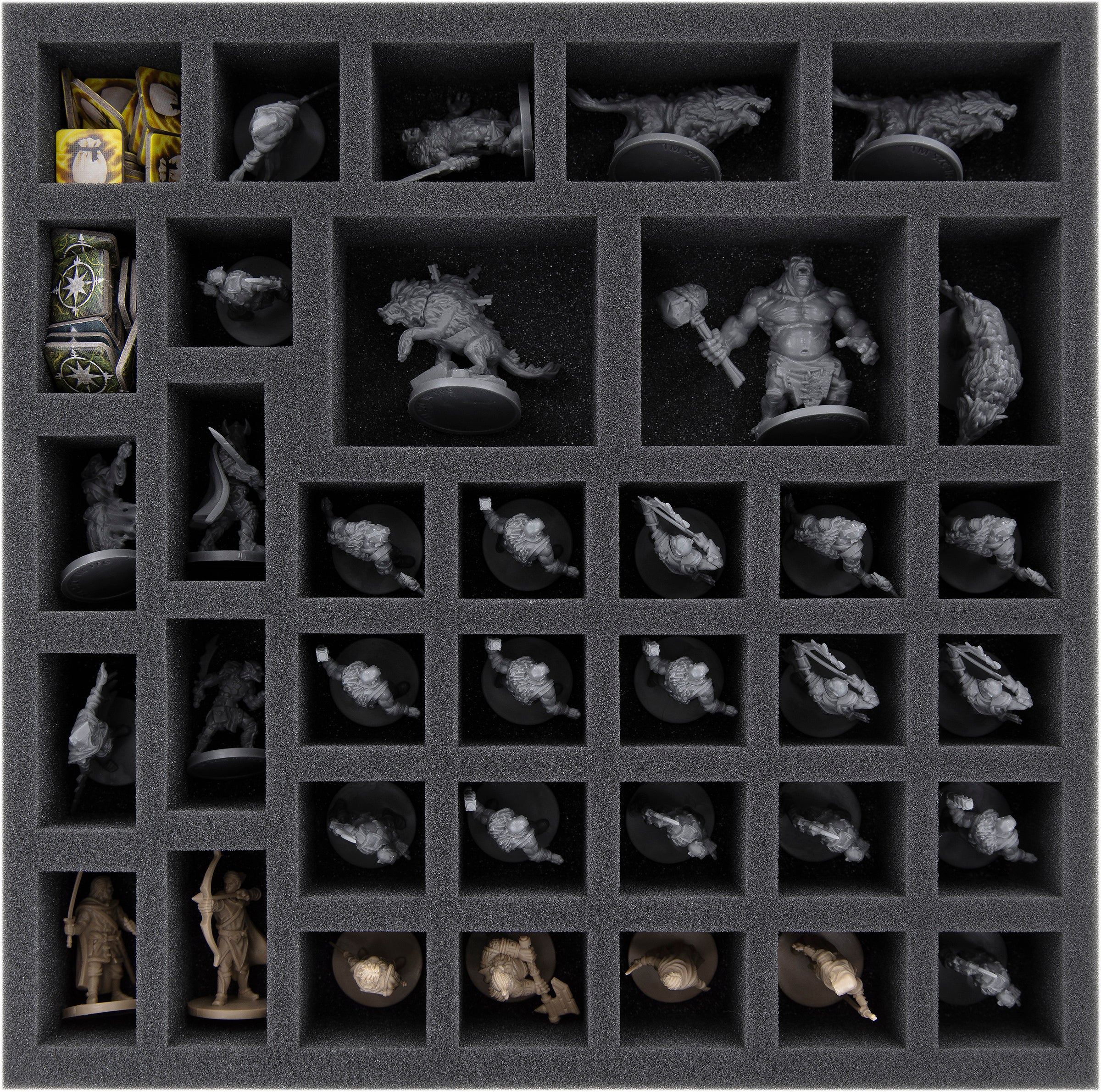 Two inserts are provided for the miniatures. Bilbo, Aragorn, Gandalf and the other heroes get their own custom-fit compartments. Just like the figures of your enemies. This way the detailed miniatures stay safely in place even when the box is transported.