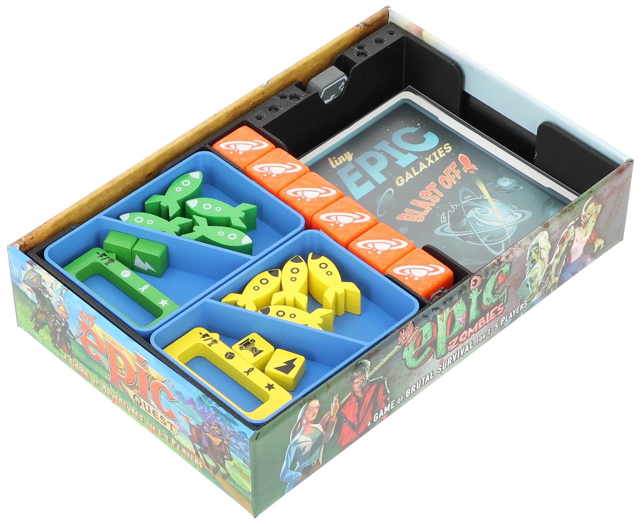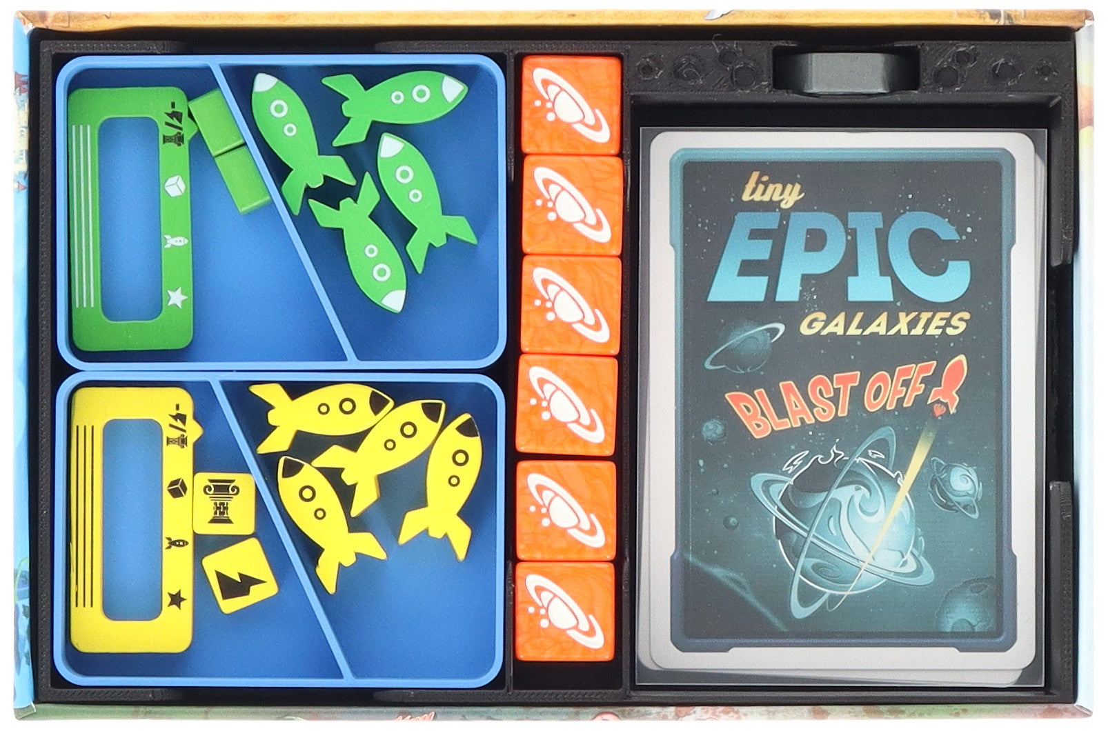 • The plastic Organizer neatly fits into the original Tiny Epic BLAST OFF! core game box (Organizer dimensions: approx. 166 x 106 x 32 mm).