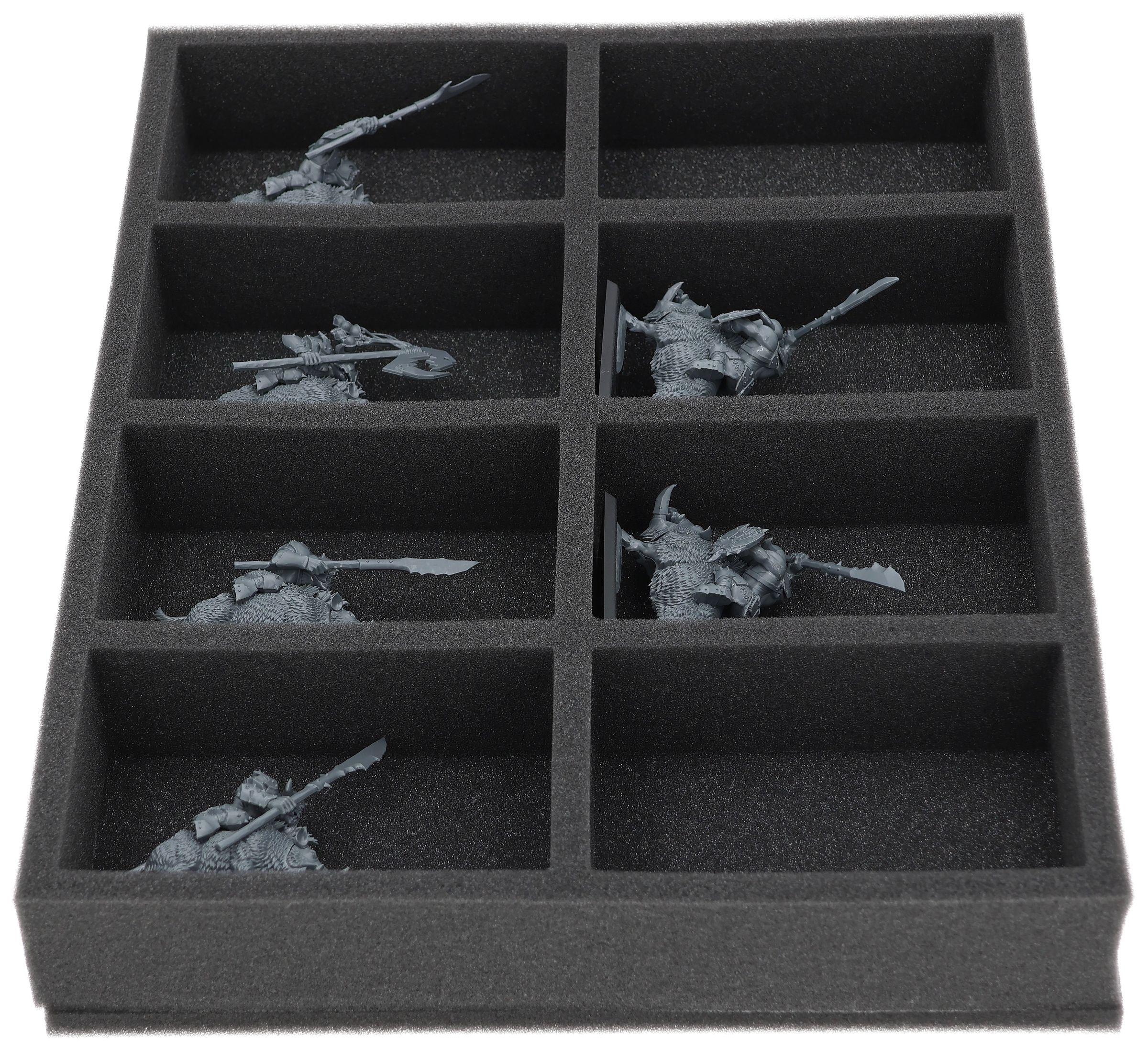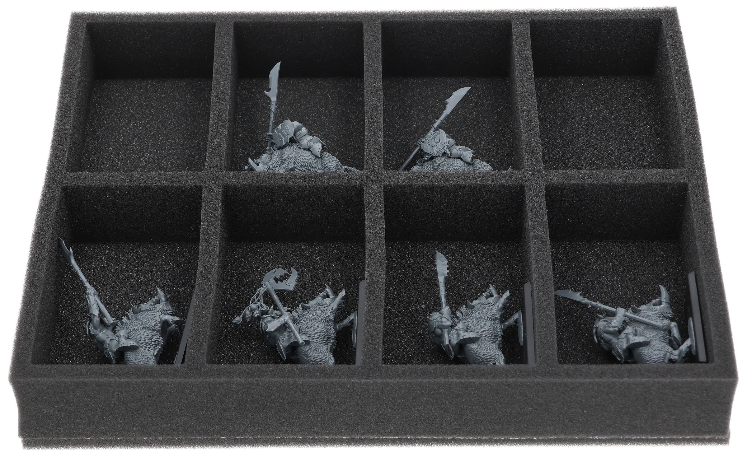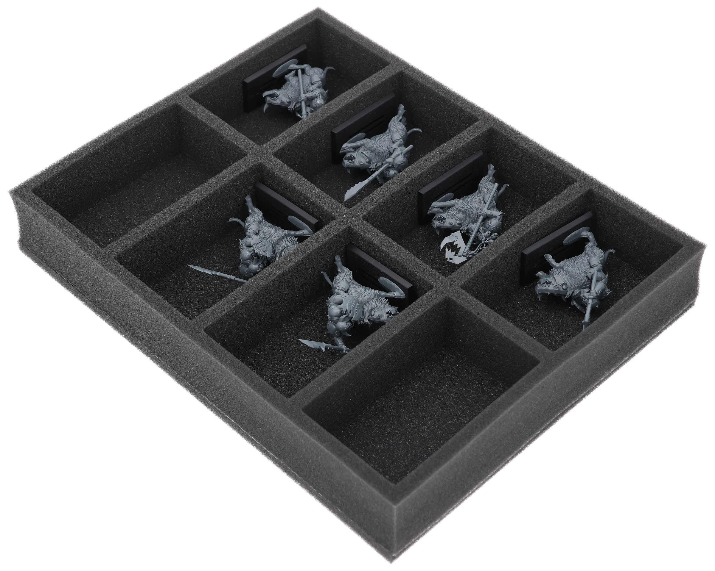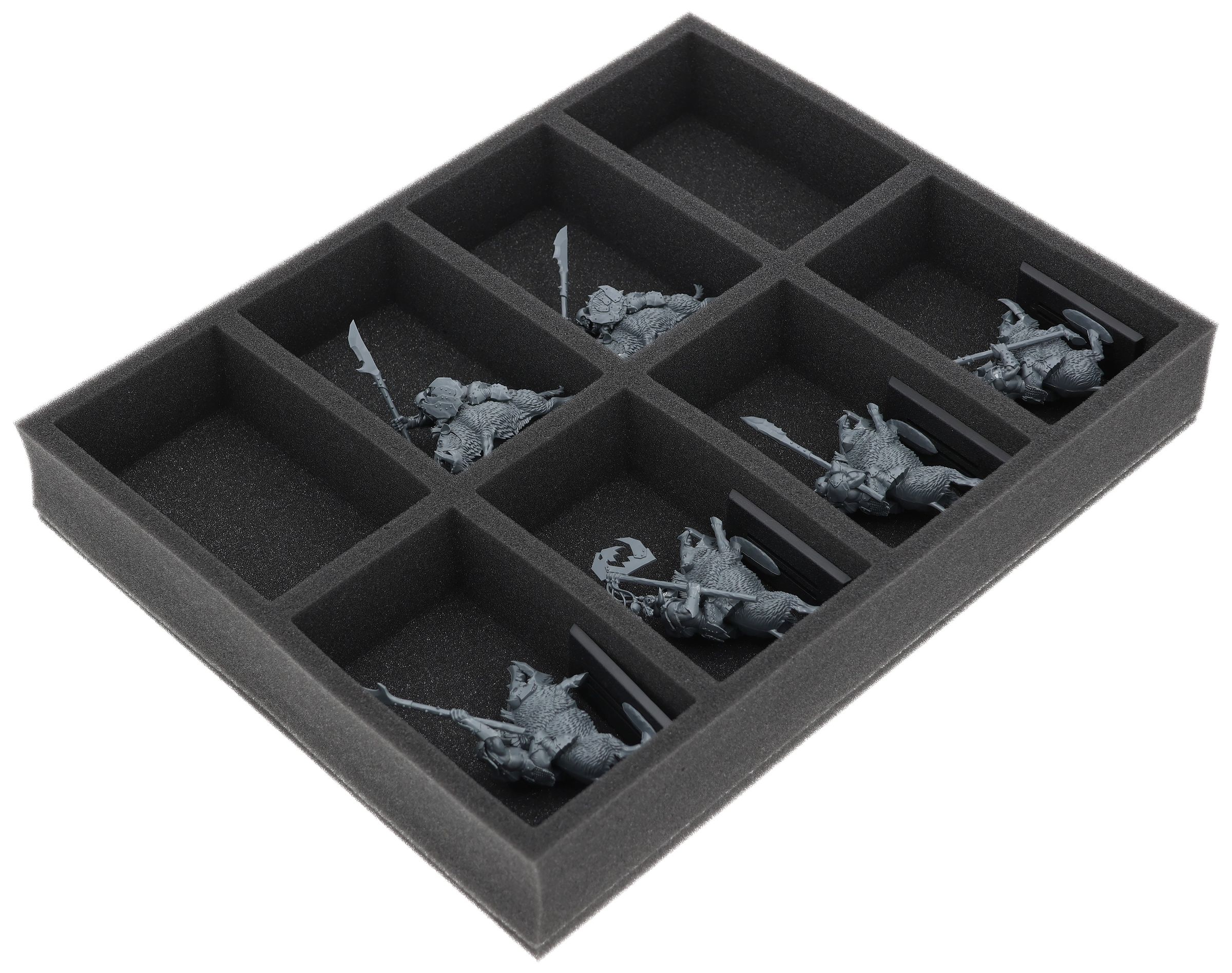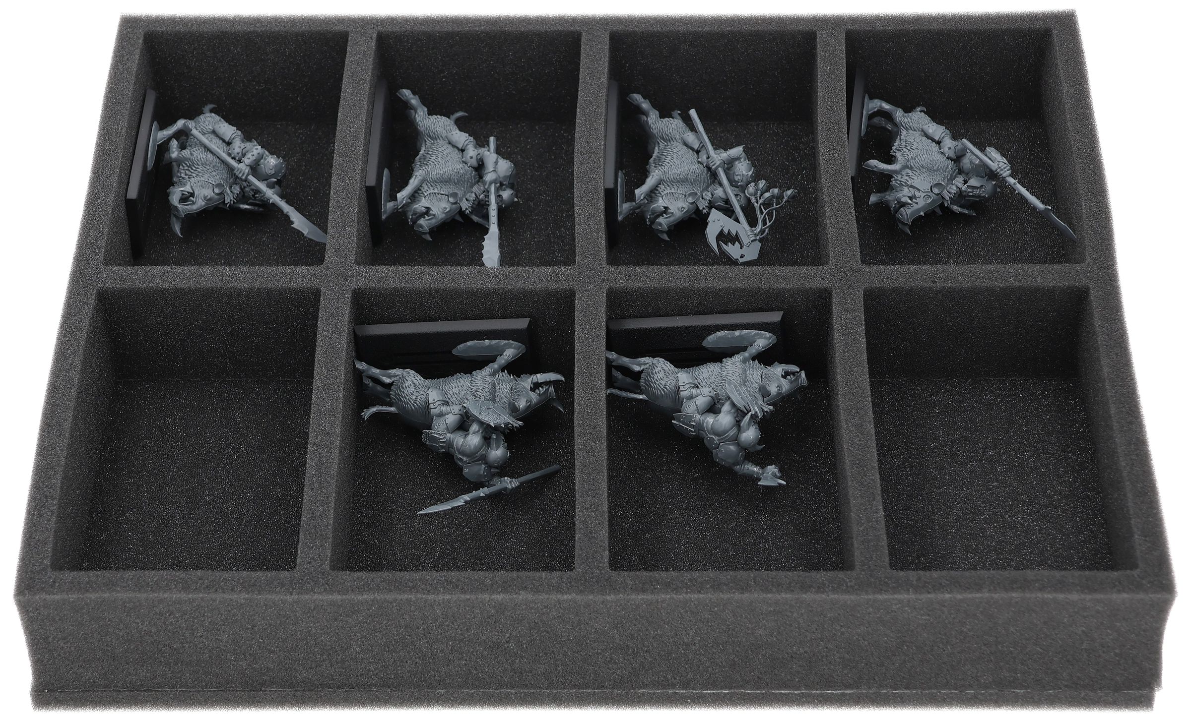 On this Feldherr foam tray you have space for up to 8 miniatures of your army. The insert is especially suitable for storing the Orc Boar Boyz Mob and similar sized models.