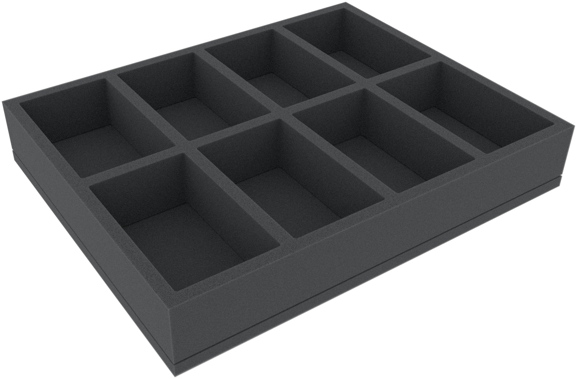 The Full-Size foam tray has the dimensions: 345 mm x 275 mm x 55 mm total height (45 mm usable height + 10 mm foam base).