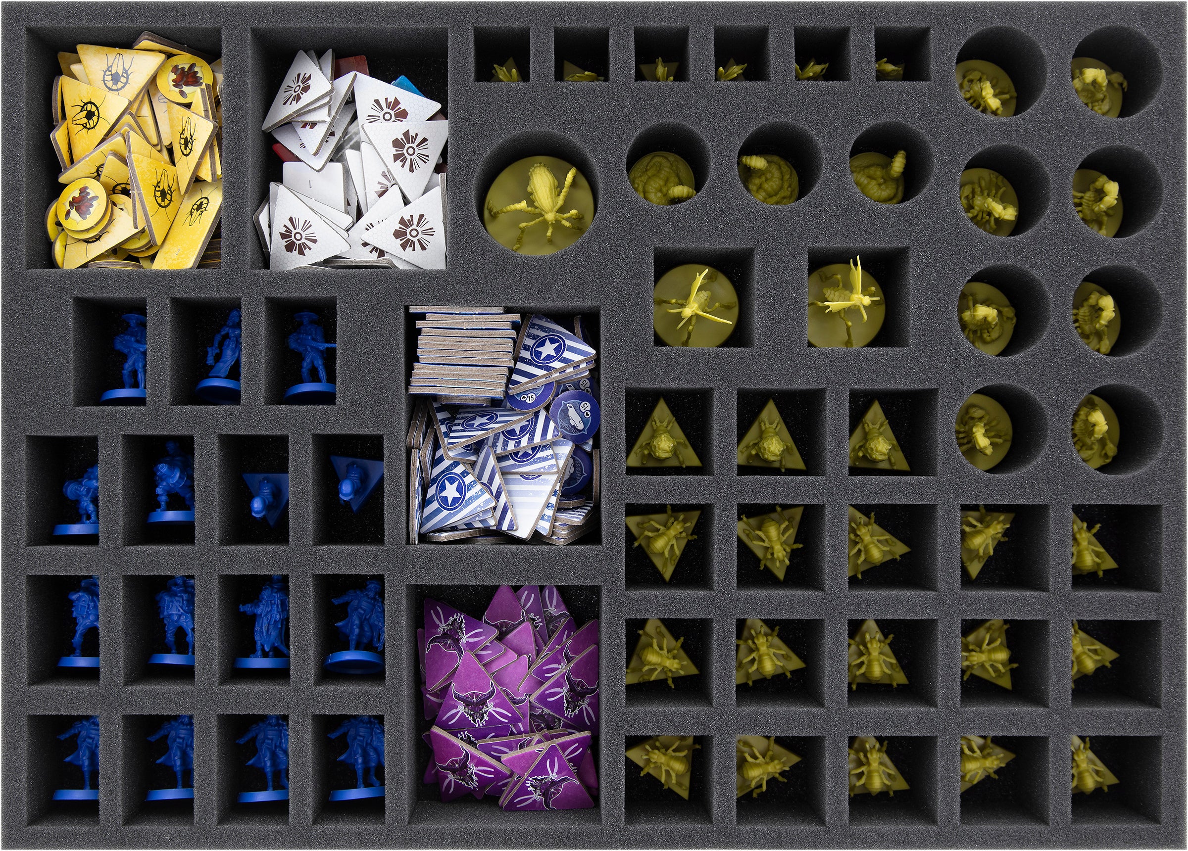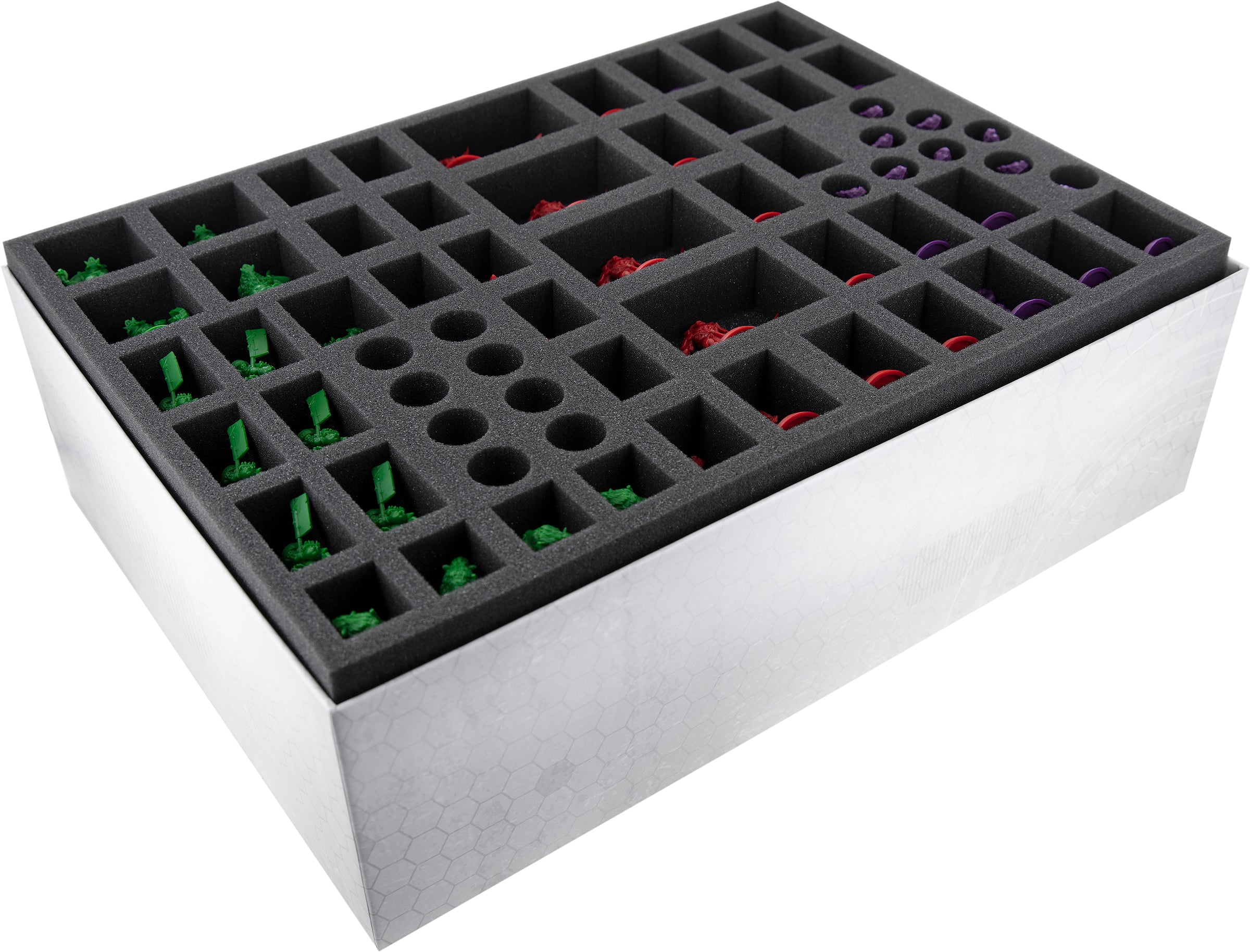 The set is completed by the included foam topper. It ensures that nothing can fall out of the trays or bump against the lid of board game during transport.