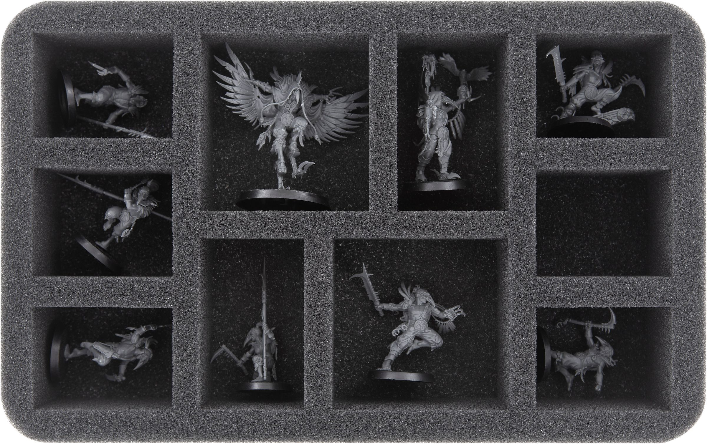 The insert offers you 10 compartments for your warrior models, one custom-fit compartment for each miniature. 2 compartments remain at your free disposal.