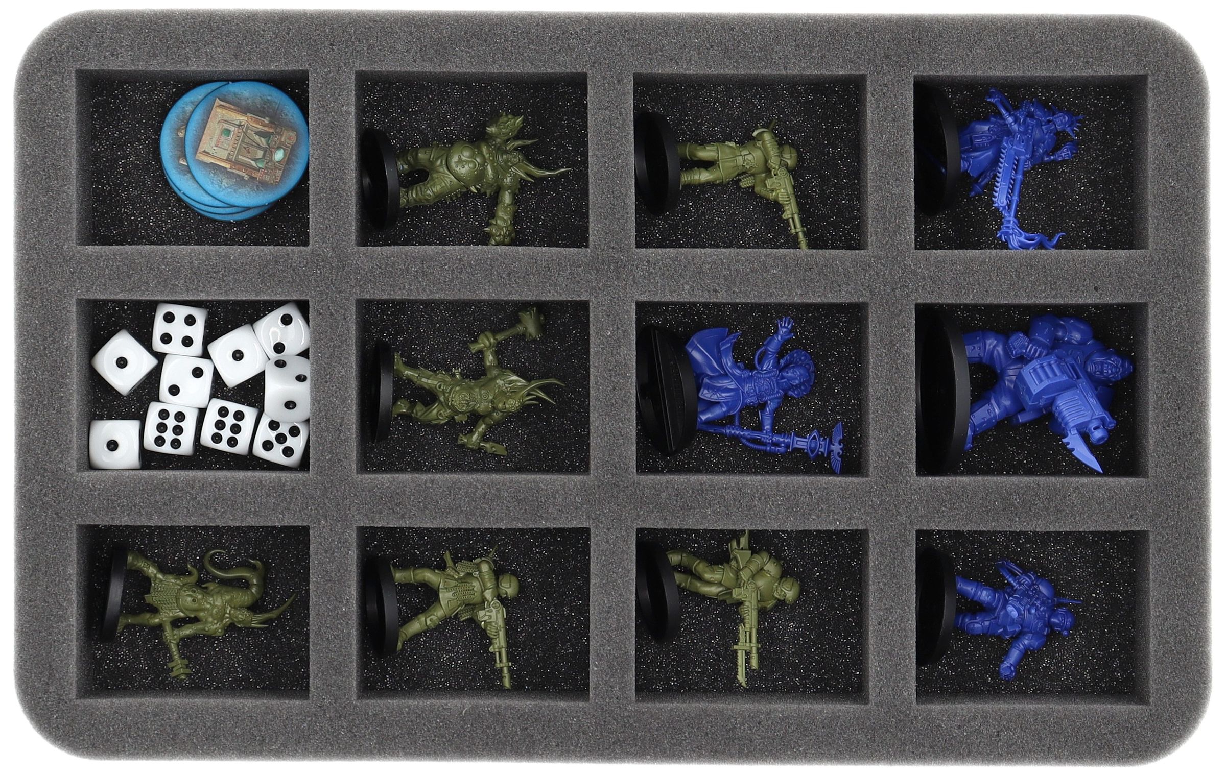 • 1 Half-Size foam tray with 12 compartments for miniatures like Pox Walkers, Traitor Guardsmen, and similarly sized miniatures (HS050I012BO)