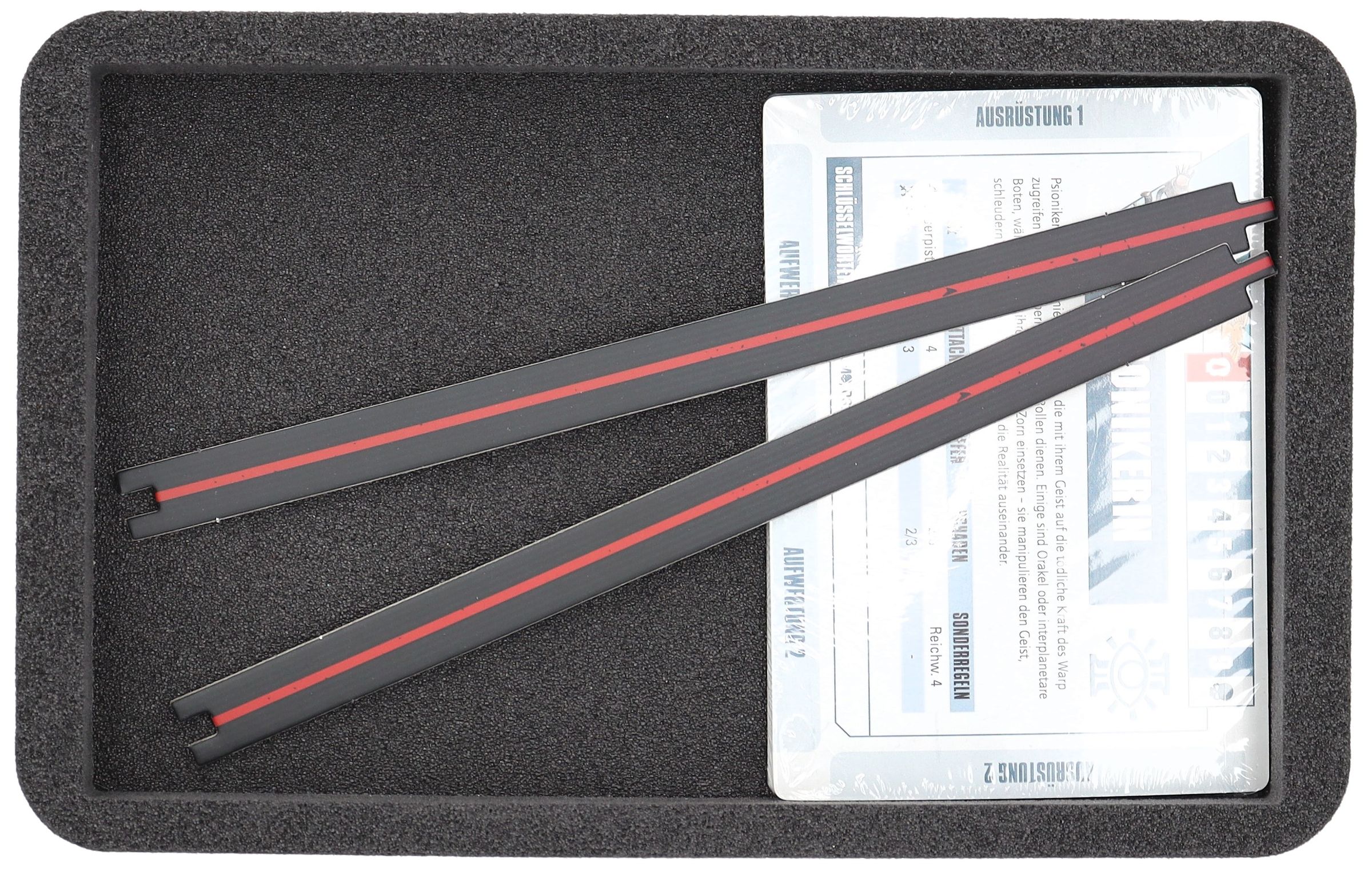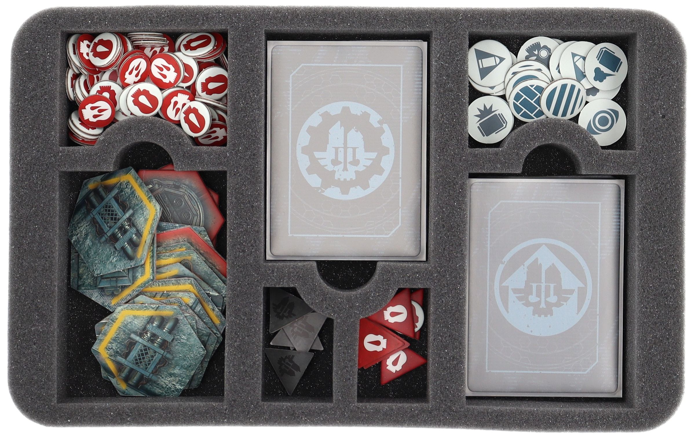 • 1 Half-Size foam tray with 7 compartments for game materials like cards in the format 63 mm x 88 mm (Standard Card Game Size), tokens, and dice (HSMEQO050BO)