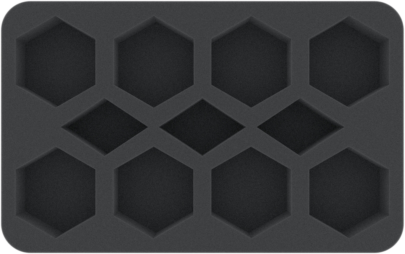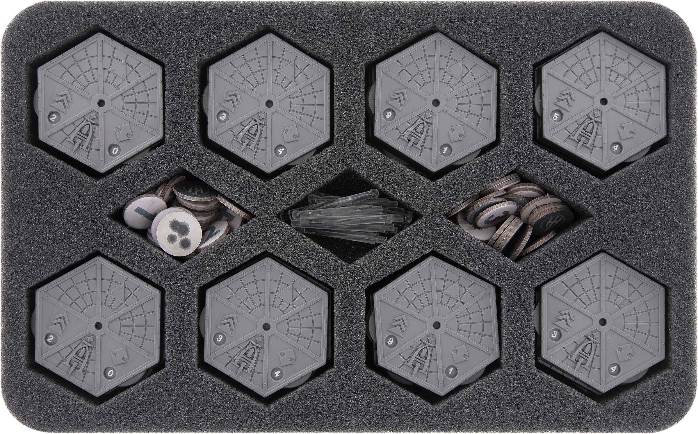 The insert is divided into 8 hexagonal compartments and three small compartments in the middle. Each large compartment holds up to four Aeronautica Imperialis flying bases.