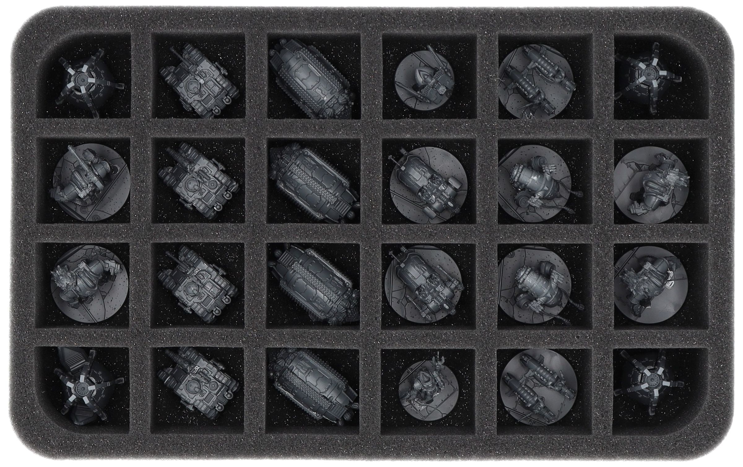 On this Feldherr foam tray you have space for up to 24 miniatures of your army. The insert is especially suitable for storing the Vultarax Stratos-Automata, Arlatax Battle-Automata, Domitar Battle-Automata, Vorax Battle-Automata, Castellax Battle-Automata, Thanatar Siege-Automata Cohort, Drop Pods and similar sized models.