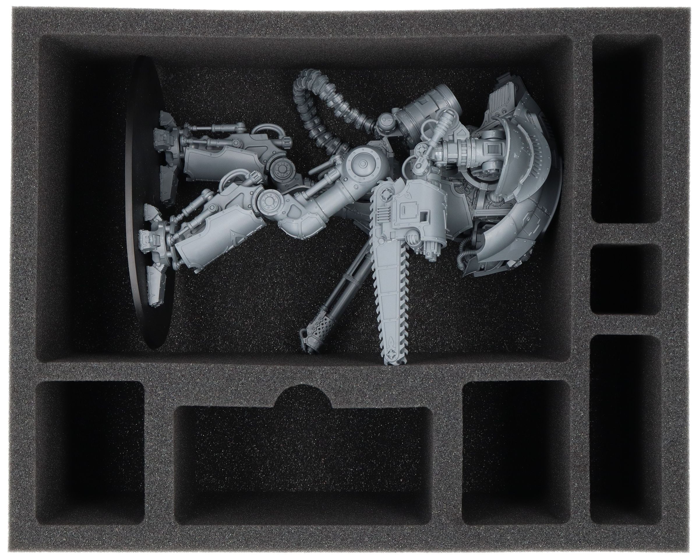 This 145mm high foam tray is divided into seven compartments. The large compartment is perfect for securely accommodating a miniature of a Cerastus Acheron Knight. Thanks to the precision cut, the detailed model has a firm grip and does not lose its grip even on rough terrain. The soft, fine-pored foam protects the details, such as the weaponry, from premature material fatigue. The colors of painted models are reliably protected here from chipping paint and abrasion.