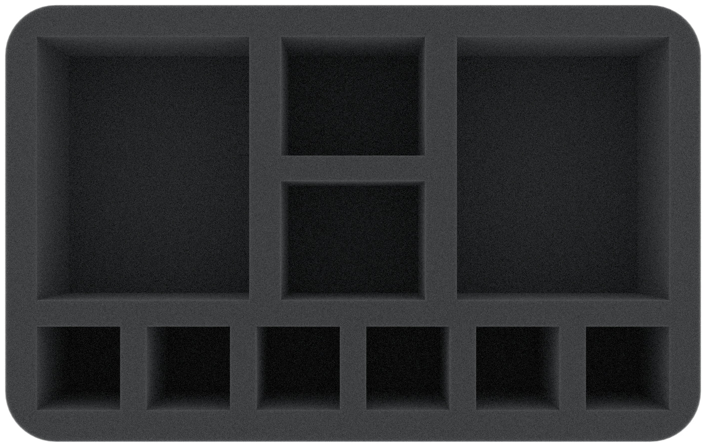 One Full-Size and four Half-Size foam trays offer your models optimal protection. Each model gets its own compartment. The custom-fit cut ensures that the miniatures stay securely in place. The soft foam protects sensitive details such as weapons, horns, and claws from damage. In this way, the colors of your models are preserved and protected from abrasion and flaking paint.