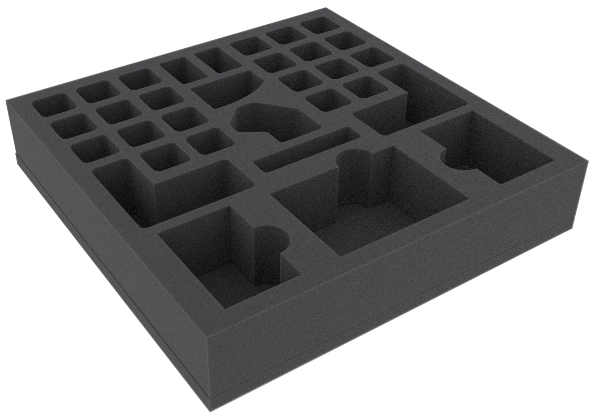 The Feldherr foam tray has the dimensions: 285 mm x 285 mm x 50 mm height. The 50 mm depth of the foam is result from 10 mm foam base and slot foam tray with 40 mm effective depth