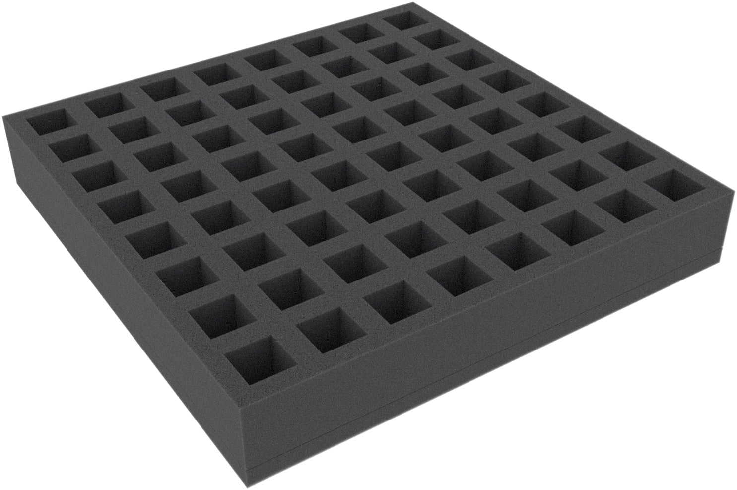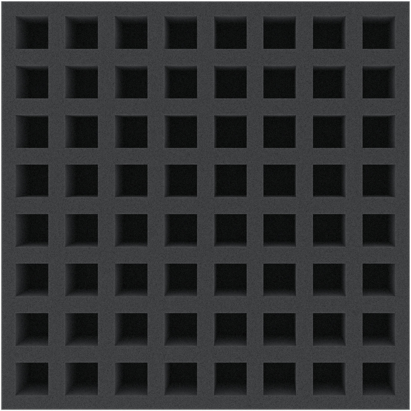 This foam tray has 64 compartments. It is ideally suitable for the safe and orderly storage of the 64 small miniatures. The tray fits into 285 mm x 285 board game boxes.