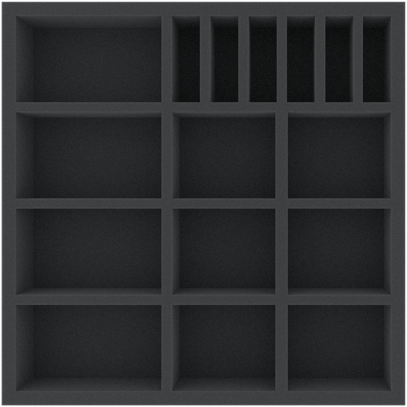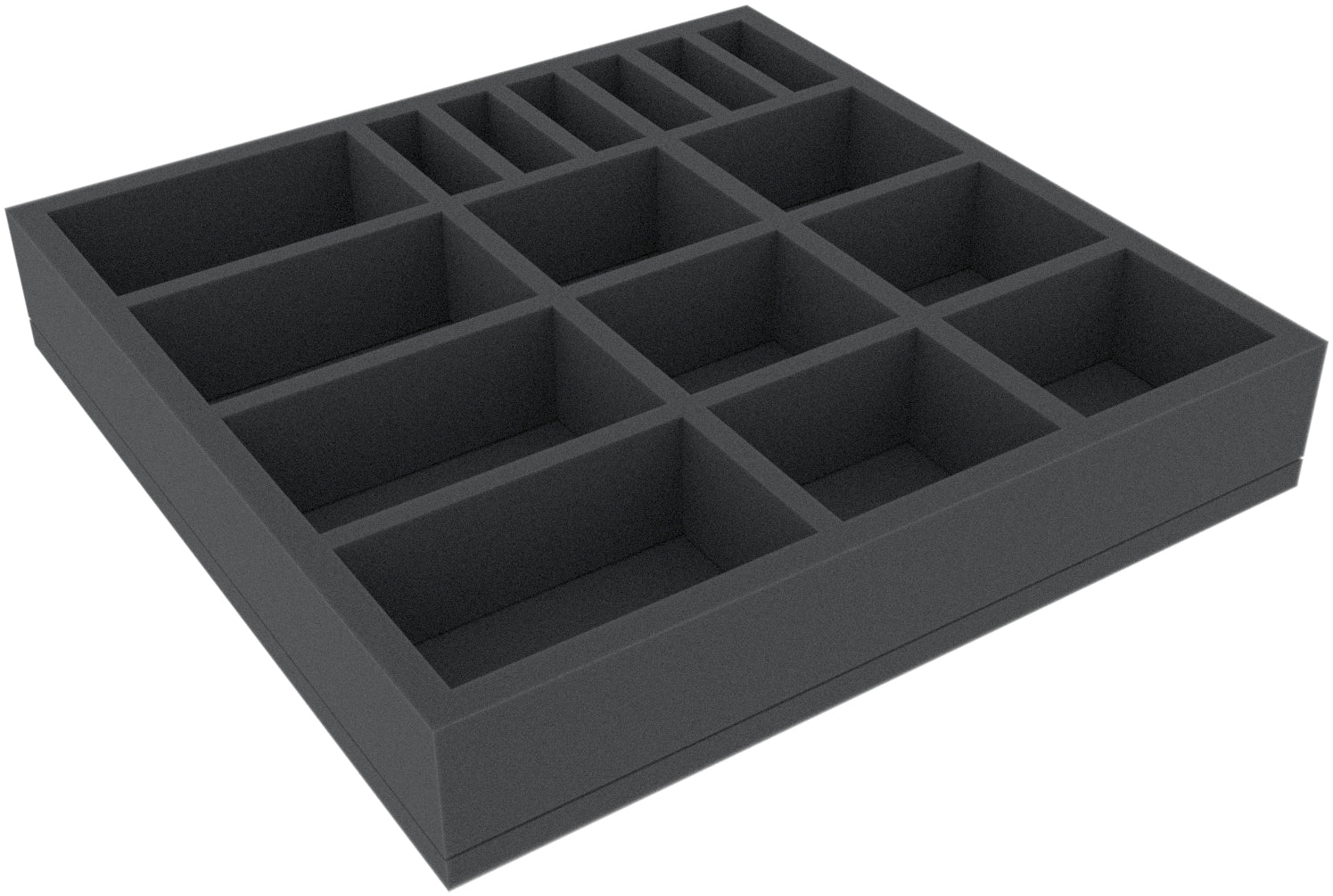 This 50 mm high foam tray is divided into 16 compartments. It is particularly suitable for the safe storage of tabletop and board game miniatures, as well as other fragile models and small parts.