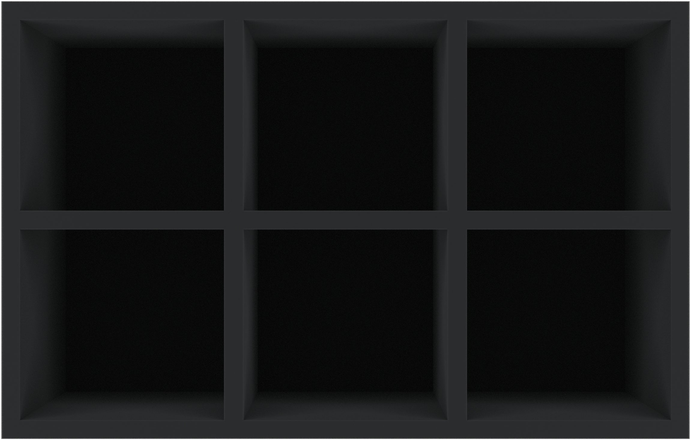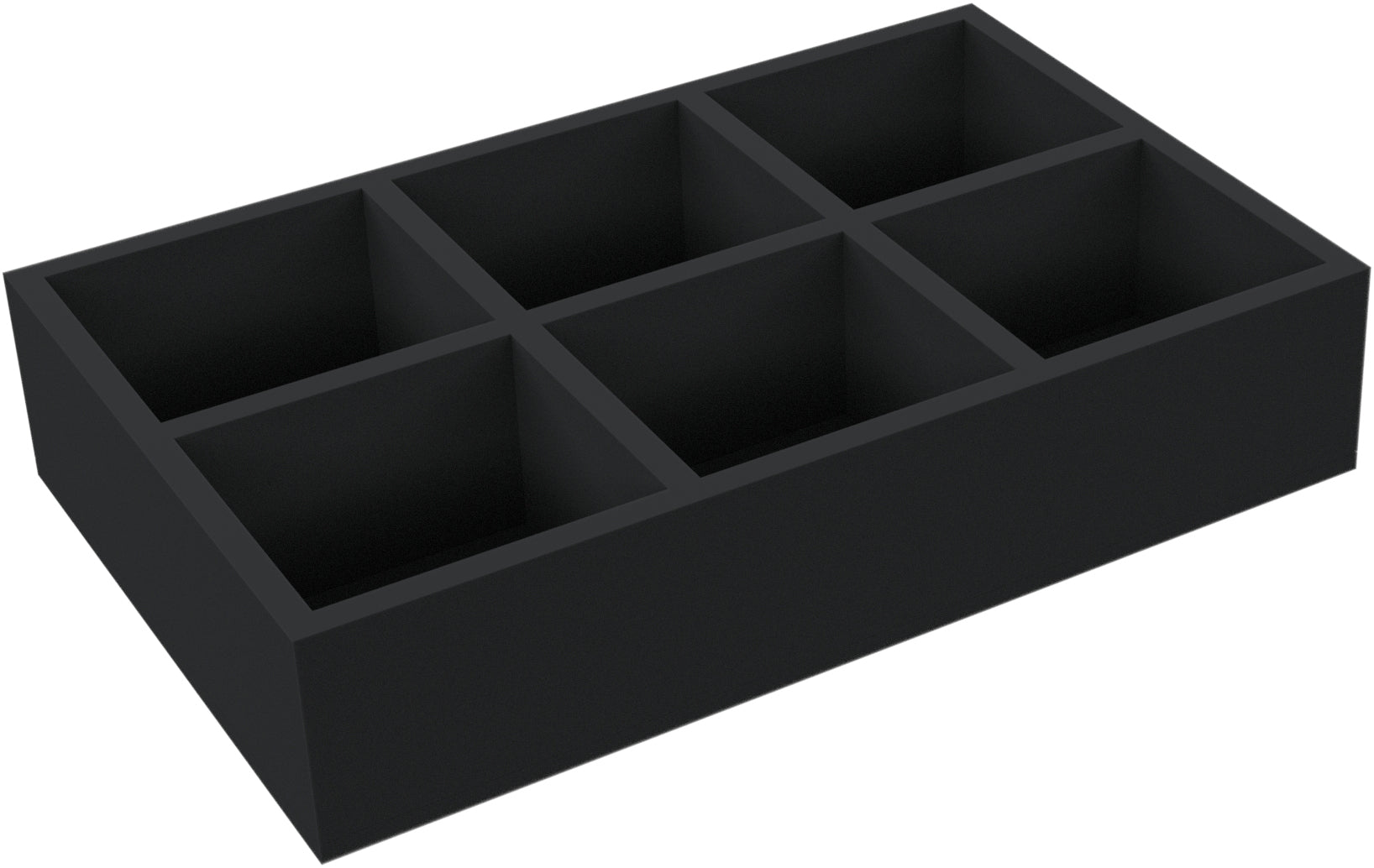 The foam insert has the dimensions: 550 mm long x 350 mm wide x 110 mm total height. The usable height inside is 100 mm. The already glued floor is 10 mm high. The 6 compartments have the following dimensions: 165 mm long x 155 mm wide x 100 mm deep.
