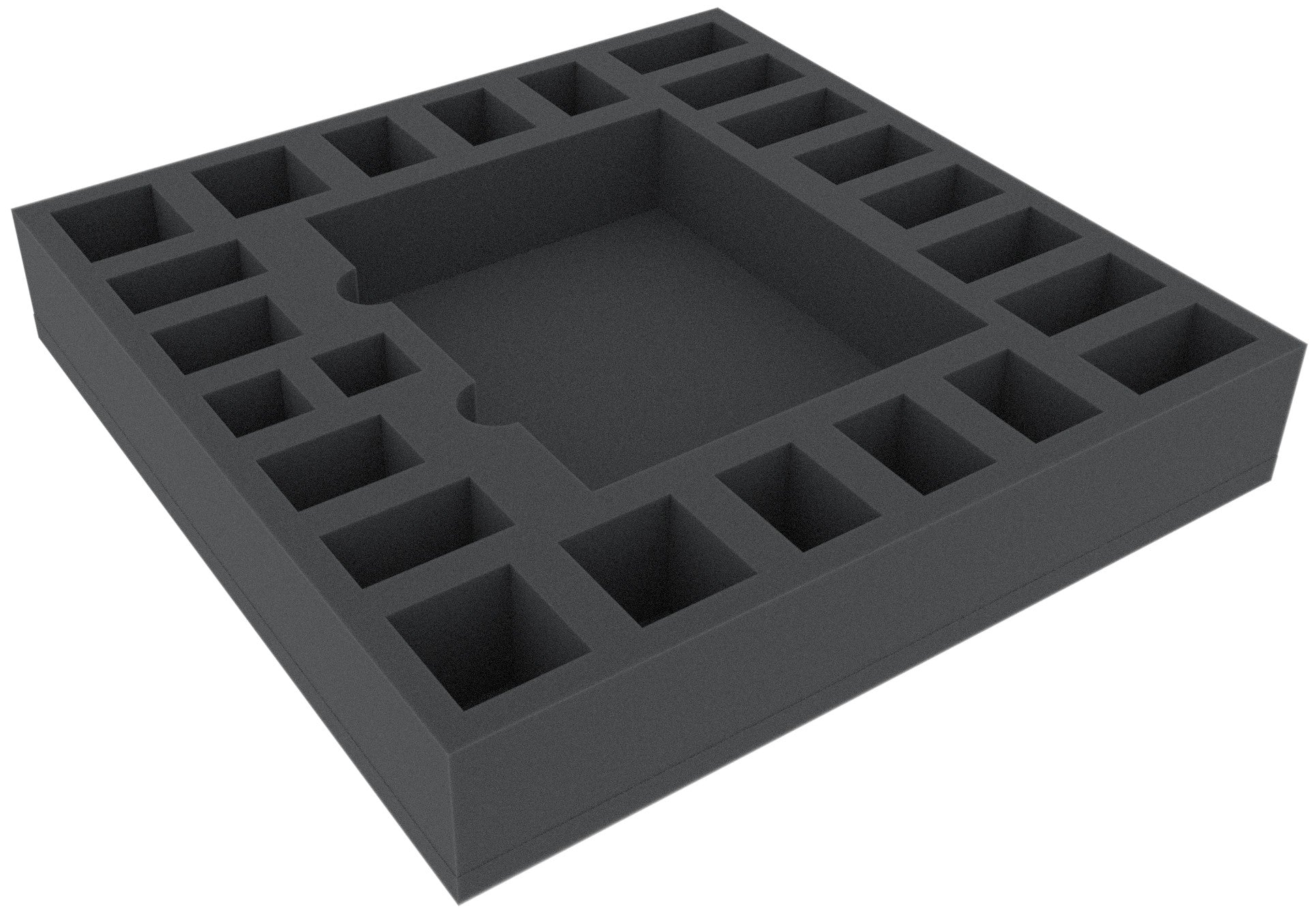 The foam tray is perfectly adjusted for the Hero Dashboards, the Hero Miniatures and one part of the Enemy Miniatures of the Massive Darkness boardgame. Thanks to the big compartment in the middle of the mat you have a perfect place for all the six Dashboards. In the other 24 cut-outs you can stow the Hero Miniatures and further from the enemy units. For example the Ogre Mage, the Bosses and the Agents. All compartments are individual designed to protect the miniatures.