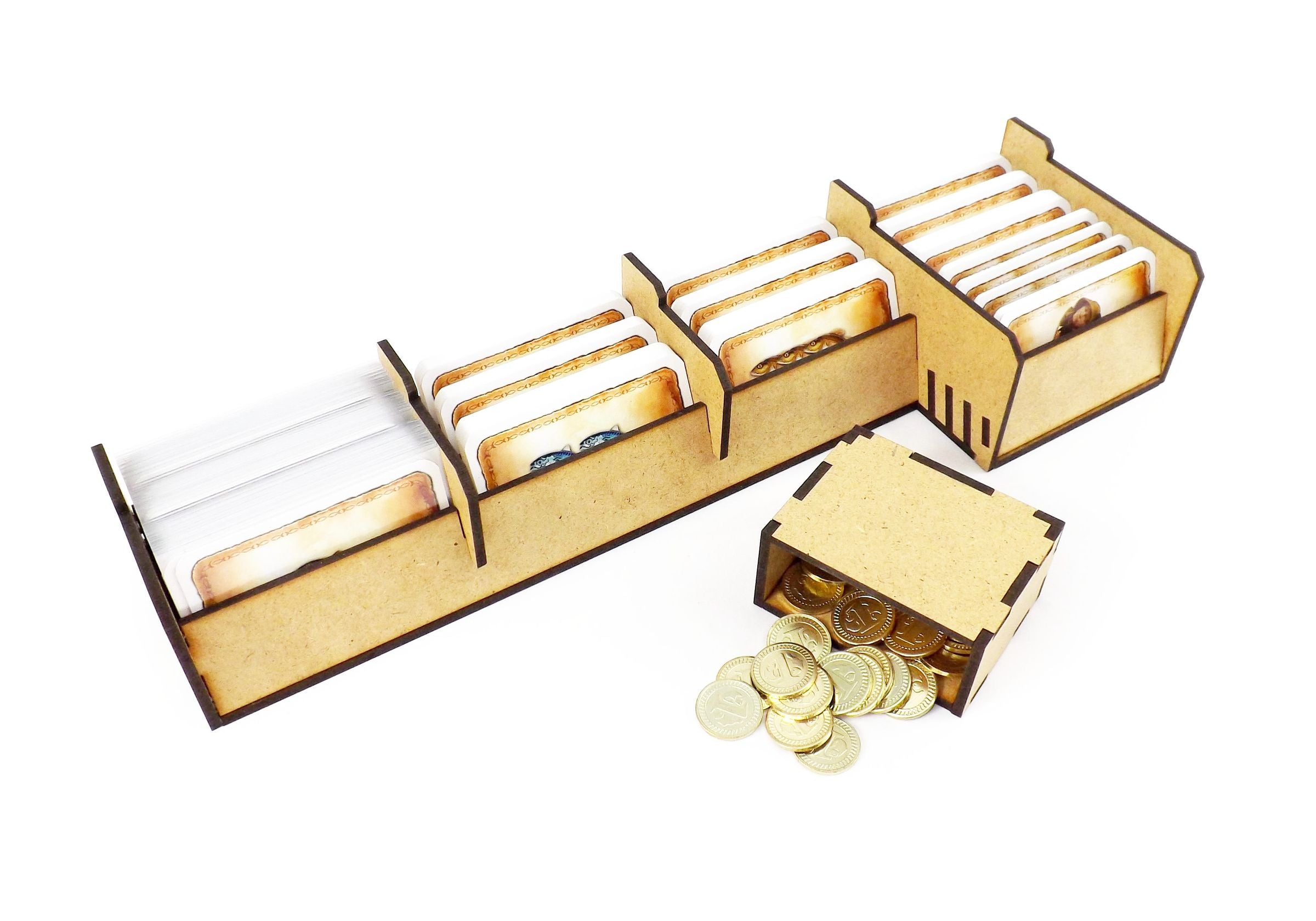 So players can clear forests, raise buildings, build ships and earn money as fishermen, Nusfjord comes with a pile of cards, wooden tokens, forest and ship tiles, coins and markers. Our organizer offers custom trays for all these components and creates order in the fishery.