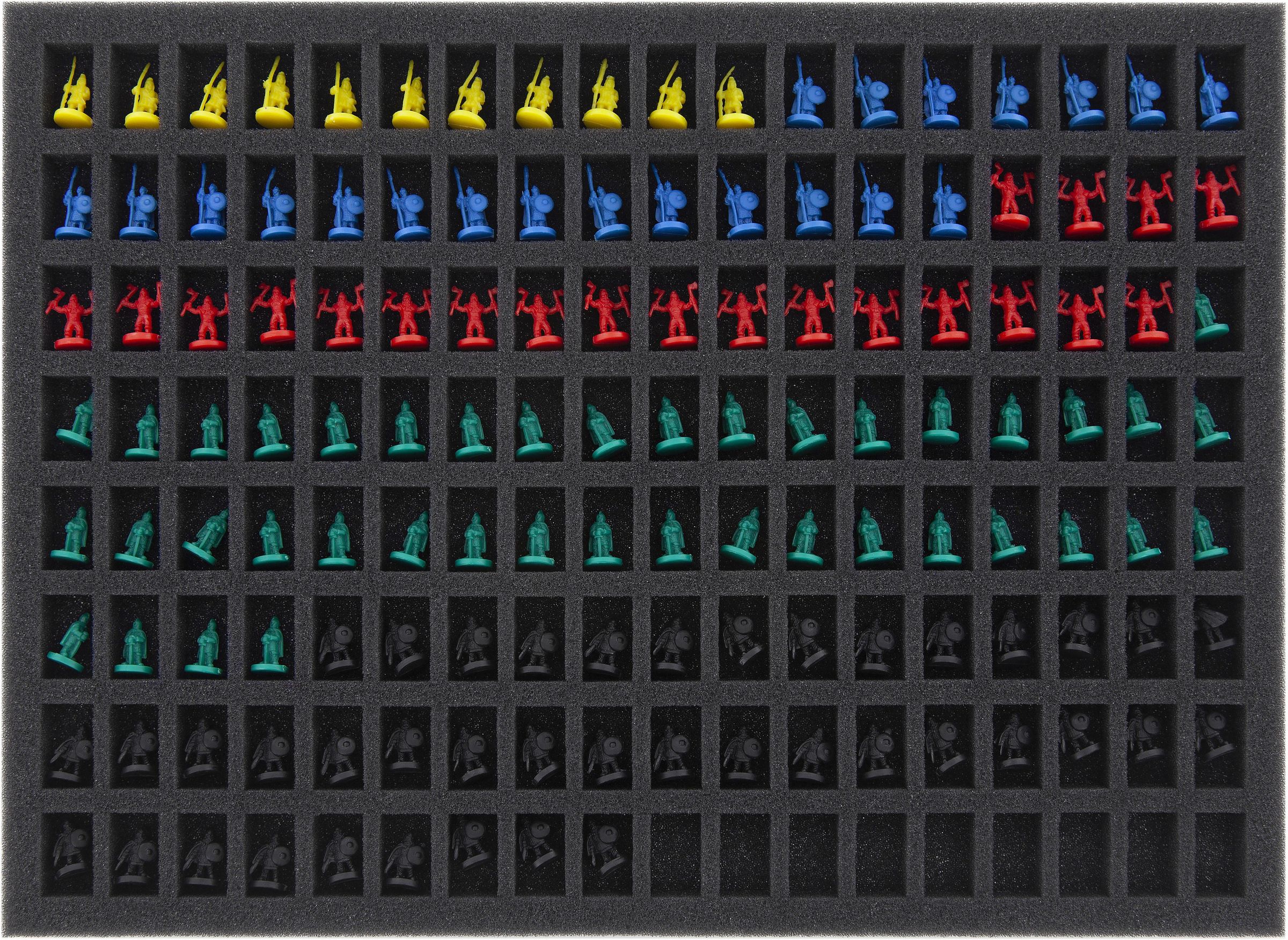 This foam tray has 144 custom-cut compartments which can accommodate all miniatures from the 878 Vikings base game and the Viking age expansion. The tray fits exactly into the board game box of the base game