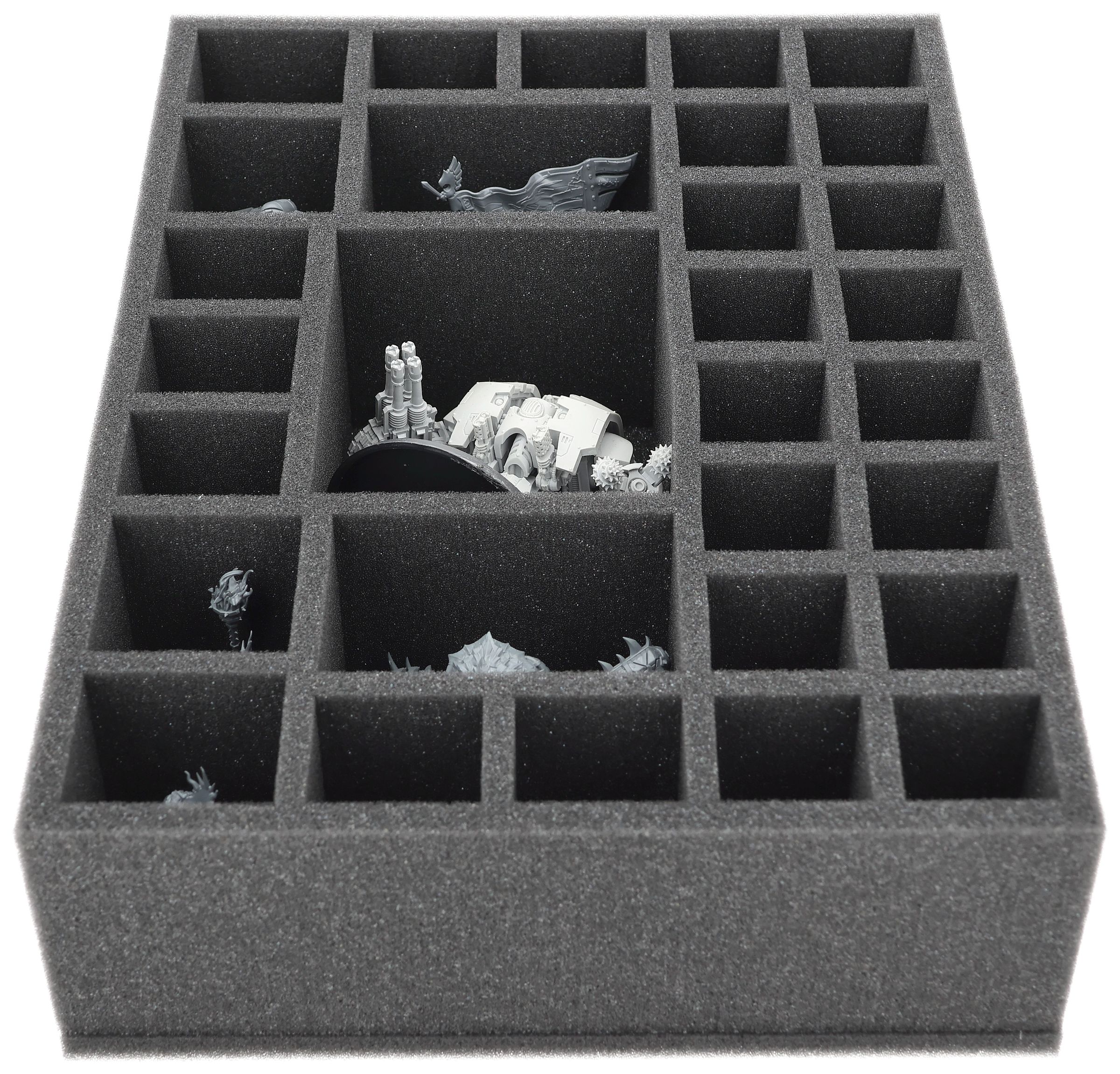 This 90 mm high Feldherr foam insert offers you 30 custom-fit compartments for the safe storage and transport of miniatures from various board game and tabletop systems. Your models remain neatly sorted and reliably protected.