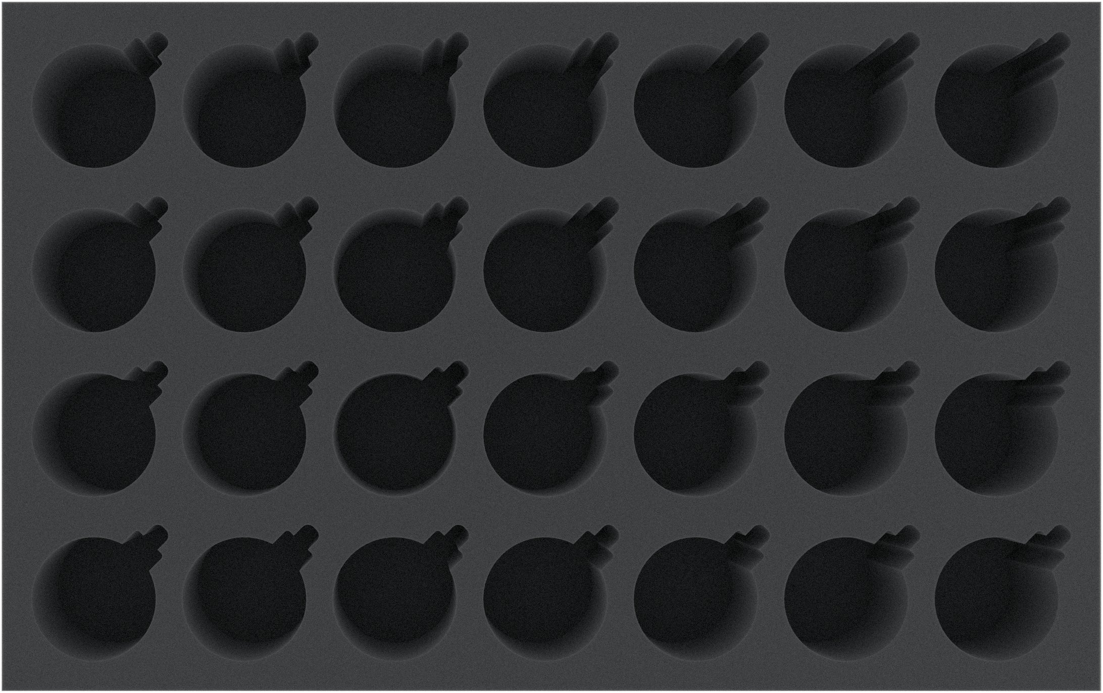 A 70 mm high foam insert with 28 circular compartments of 60 mm diameter with small bell- or lamp-shaped extension.
