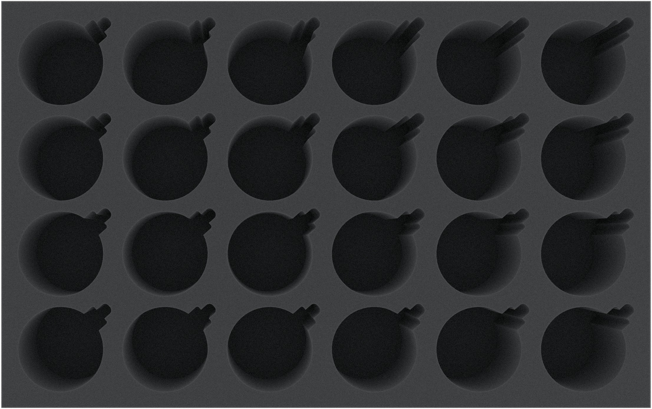 A 80 mm high foam insert with 24 circular compartments of 70 mm diameter with small bell- or lamp-shaped extension.