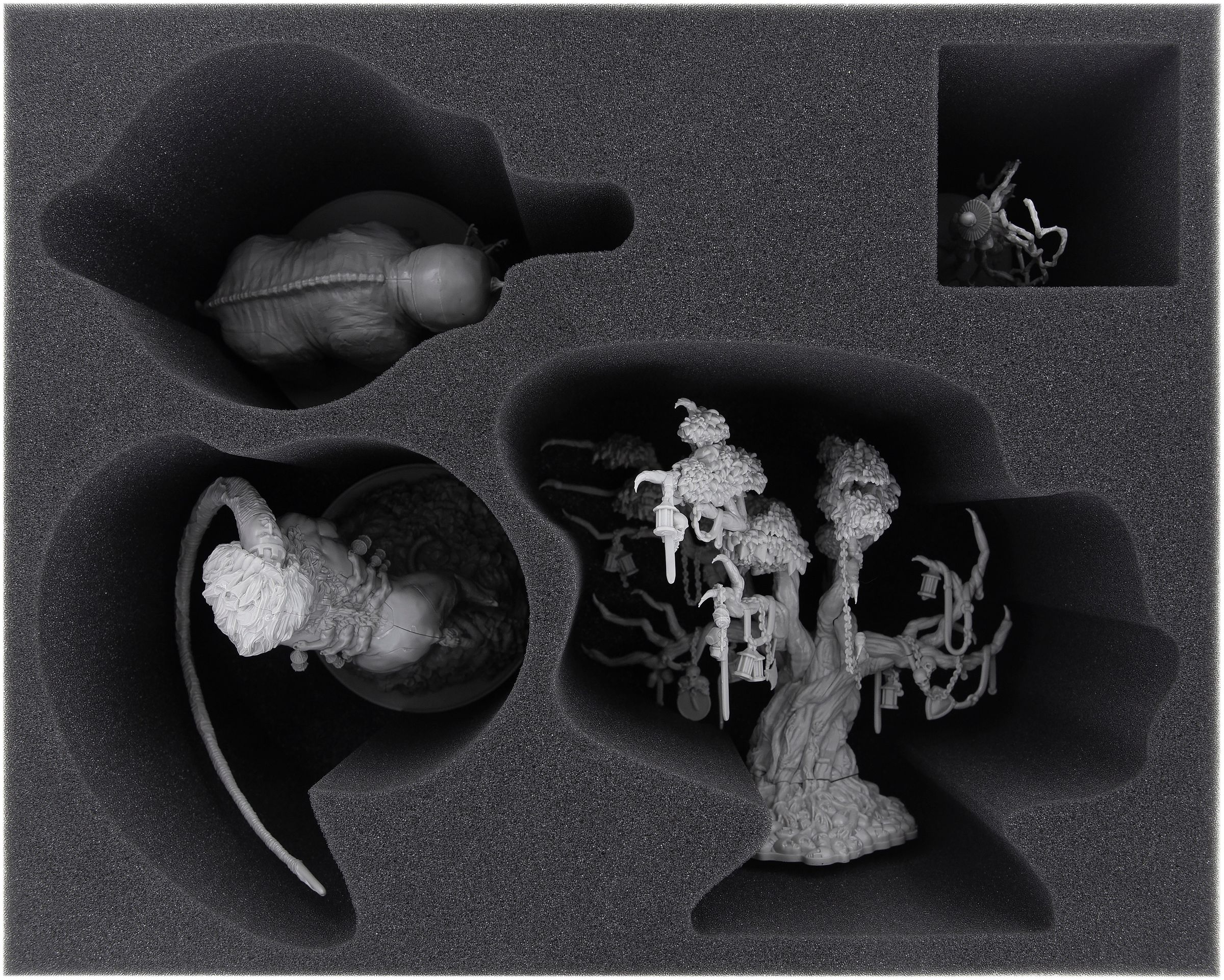 The set is built around the specific needs of Kingdom Death: Monster’s large and detailed Wave 2 models, which are both imposing and relatively fragile. To keep these centerpiece figures safe, the foam is cut precisely to their shapes and arranged to minimize stress on vulnerable areas such as antennas, branches and extended limbs.