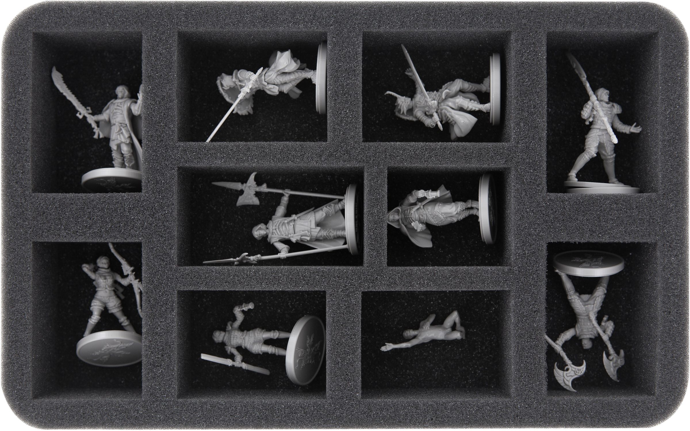 Beyond these large centerpiece models, the remaining foam inserts in the set are dedicated to the many smaller miniatures from Waves 1 and 2. A Full-Size tray with 16 compartments (FSMEFP040BO) and two Full-Size trays with 25 compartments each (FSLQ050BO and FSLQ040BO) provide ample, clearly separated spaces for a wide range of figures. Additional Half-Size inserts - two with 7 compartments each (HSLZ060BO), two with 9 compartments each (HSMEAJ035BO), and one with 10 compartments (HSLM050BO) - further expand the capacity for small models, allowing you to organize your collection in a structured and easily accessible way.