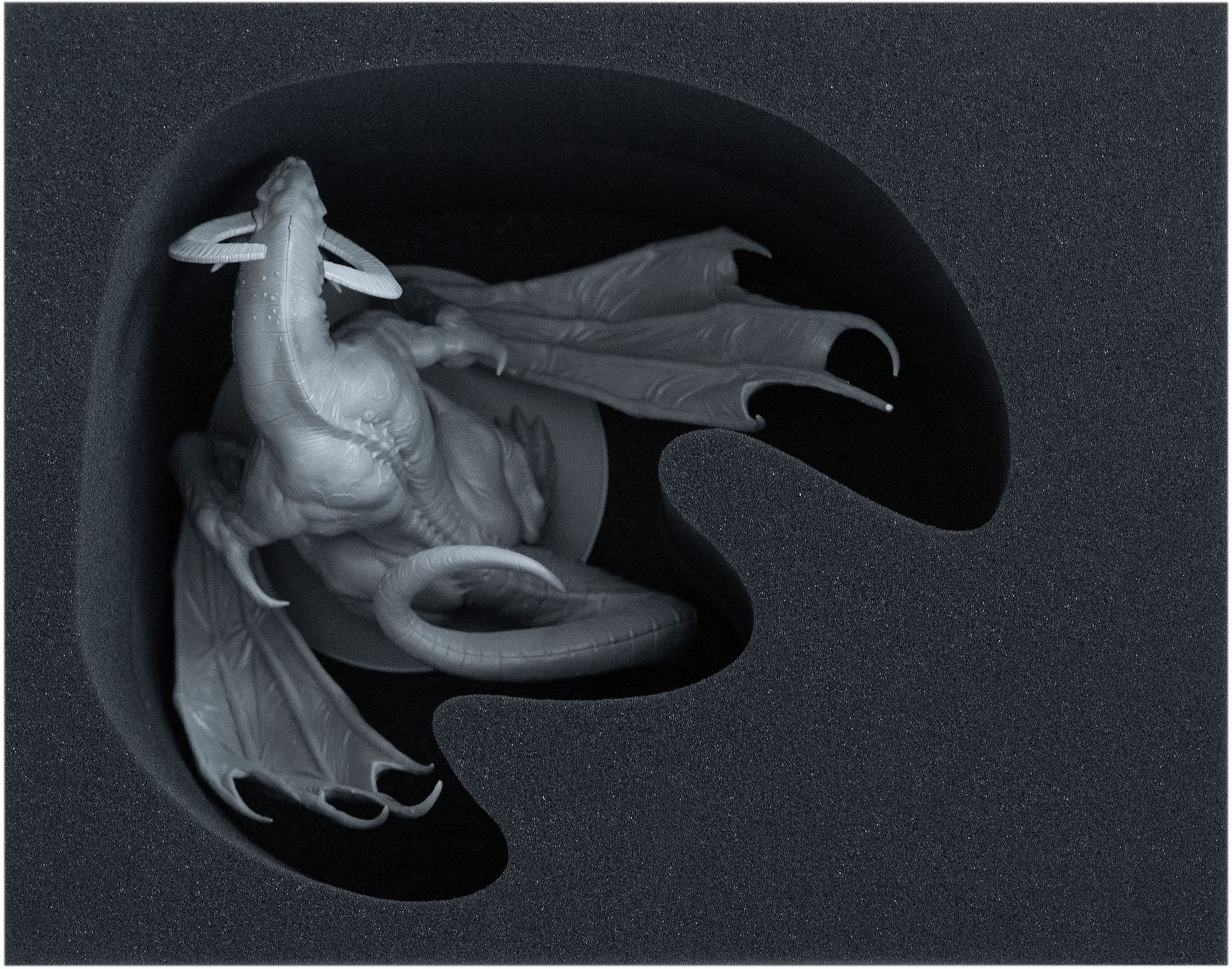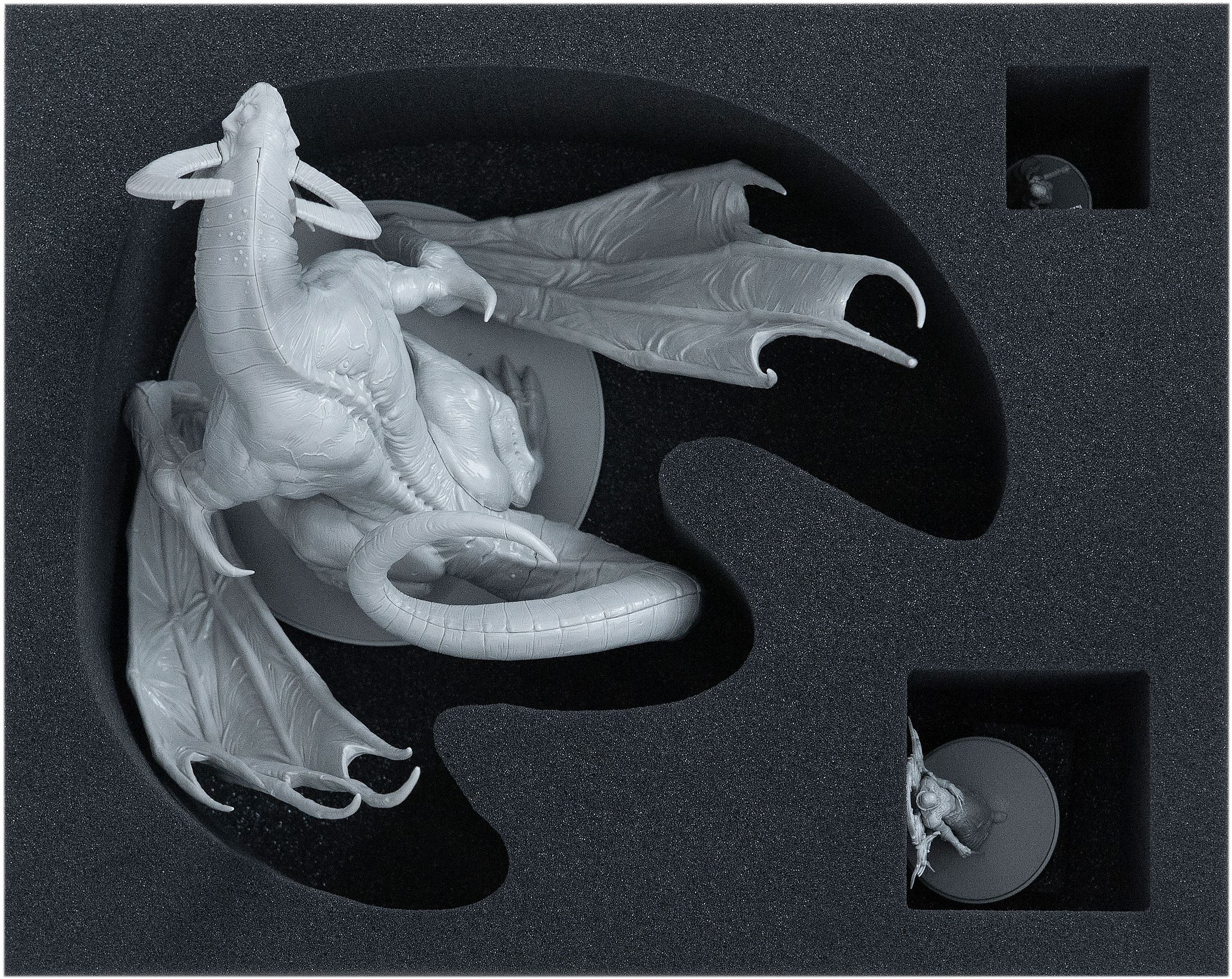The Dragon King is so large that it requires a two-level storage solution. The lower of the two stackable Full-Size inserts has a 10 mm base and is divided into three compartments. One of these compartments is cut exactly to the footprint and silhouette of the Dragon King, providing a stable and secure stand for the model. The two remaining compartments in this lower tray are sized for smaller miniatures. Once the Dragon King is placed in the bottom insert, the second Dragon King insert is positioned on top. This upper tray has a custom cut-out designed to accommodate the dragon’s upper body. When it is placed over the lower insert, it covers and protects the smaller models beneath while also enclosing the Dragon King so that it is safely held from all sides.
