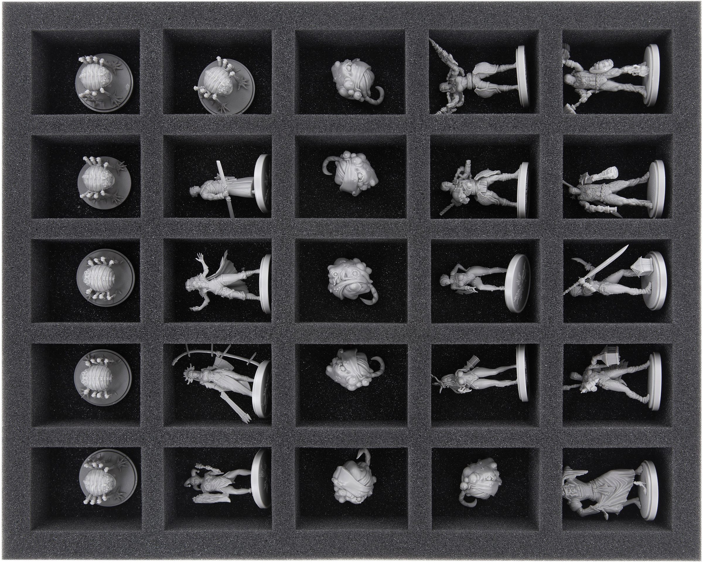 The remaining Full-Size and Half-Size foam inserts are equipped with assorted compartment layouts to accommodate the smaller Wave 1 and Wave 2 miniatures, for example characters such as the Kings Man or Flower Knight. The trays with 25, 16, 10, 9 and 7 compartments give you a range of slot sizes for different models, so that each miniature can be placed in an individual cavity suited to its dimensions.