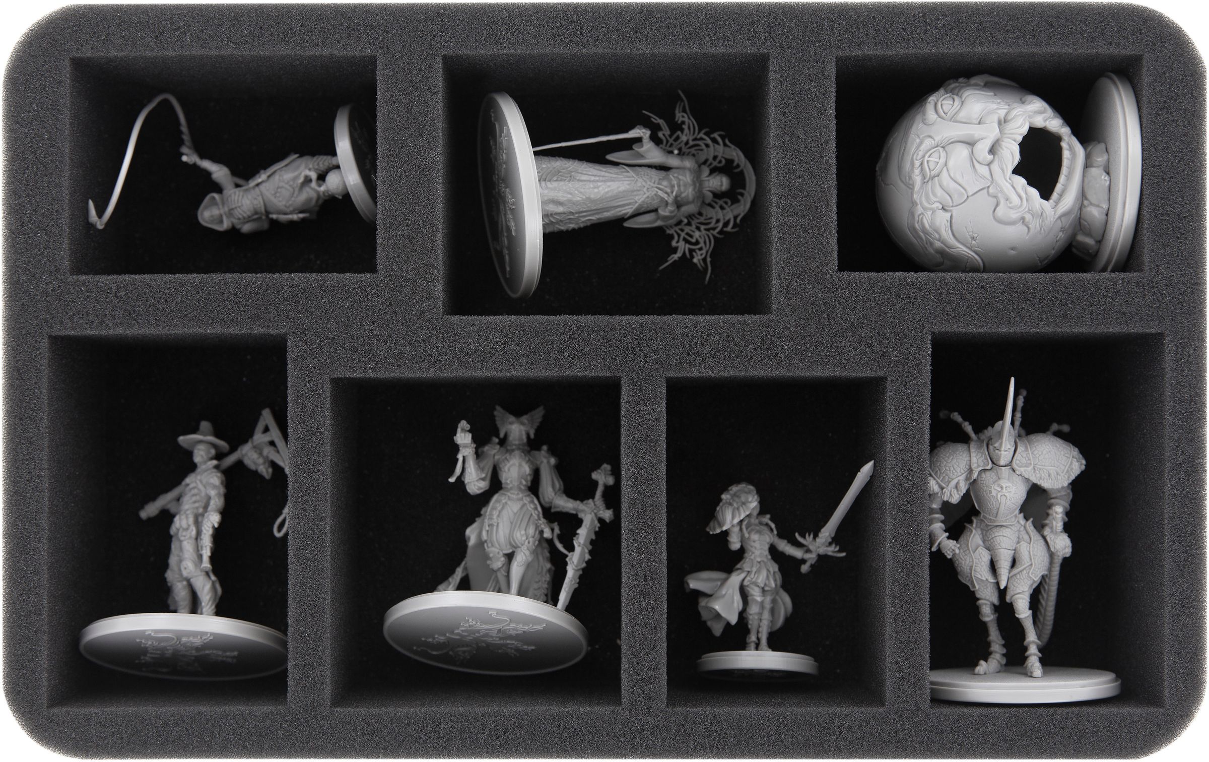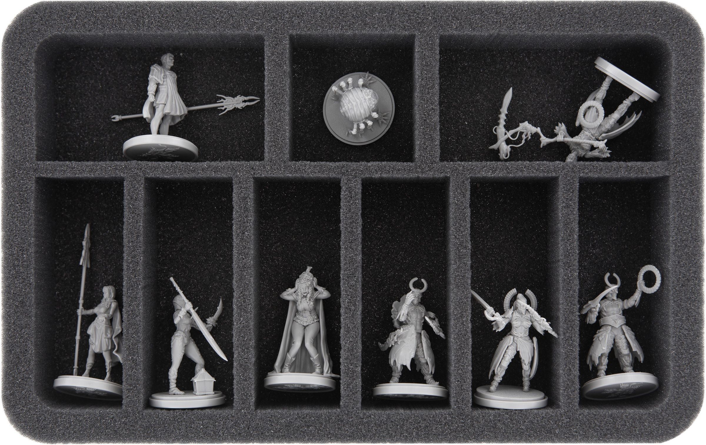By storing each figure in its own compartment, the foam protects sensitive parts from snapping off and helps prevent paint from rubbing or chipping during movement. At the same time, the structured arrangement in the Full-Size and Half-Size trays keeps your collection clearly sorted. This means you can find the required miniatures quickly and reduce the time needed for setting up your games, leaving more time for actual play.