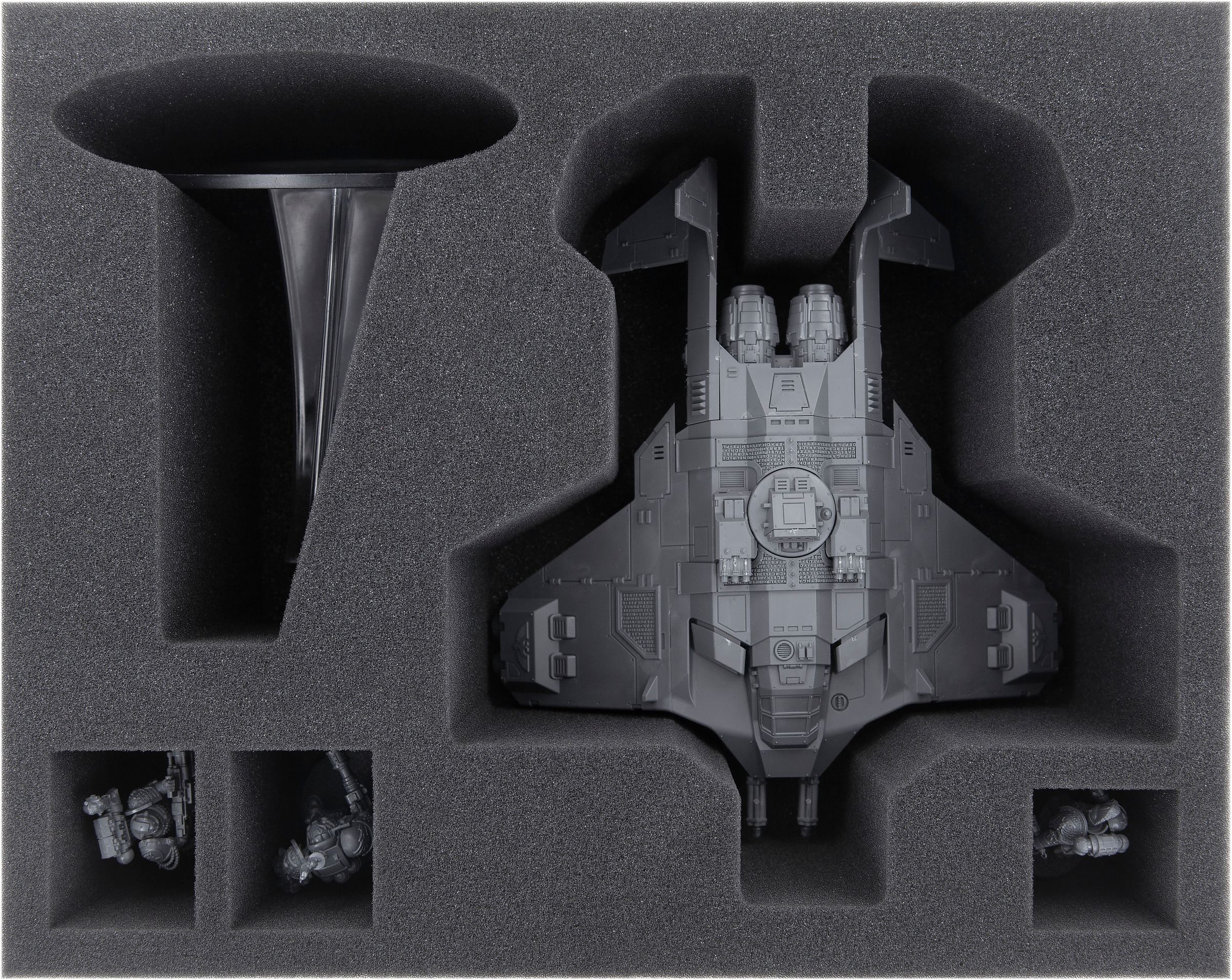 - 1 Full-Size foam tray with 5 compartments for one Corvus Blackstar and three smaller miniatures e.g. Watchmaster or Deathwatch Kill Team (FSMEPX105BO)