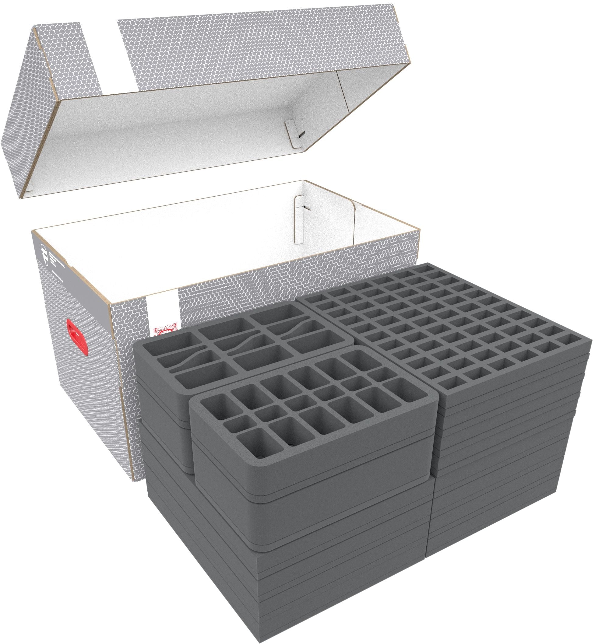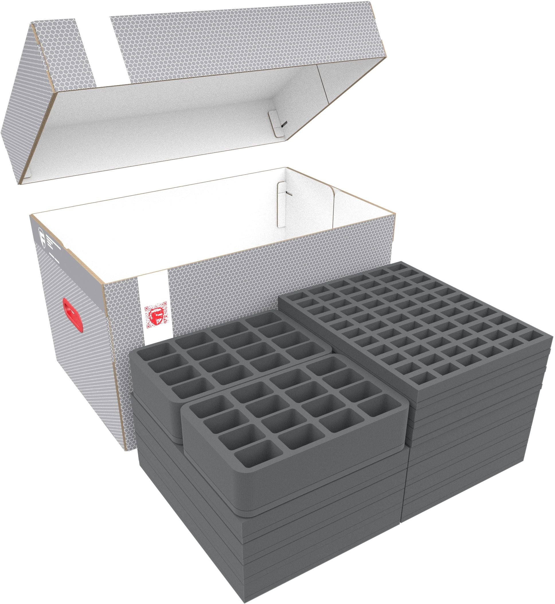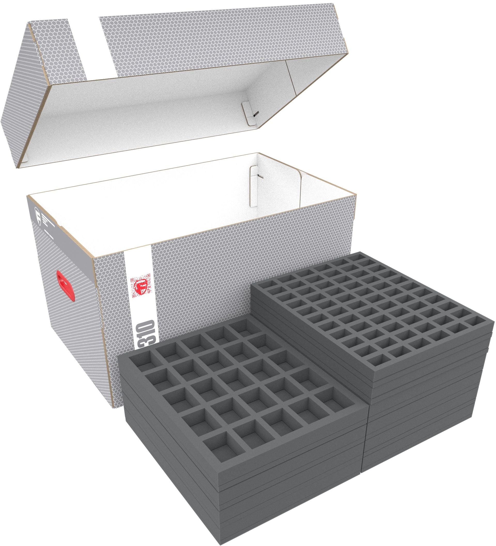• 4 half-size foam trays with 25 compartments each for expansive historical models such as Knights Templar or cannons of the French Imperial Guard, as well as for miniatures with similar dimensions (FS035A030)