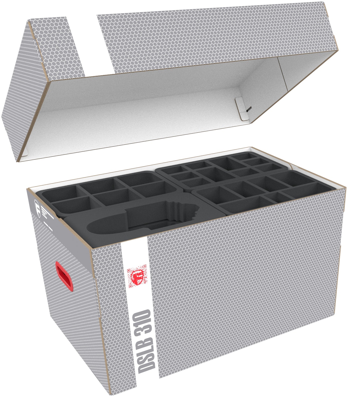 All these foam trays are stacked inside the high quality Storage Box DSLB310. It is made of coated, double-walled cardboard. Making it not only pleasantly light, but also particularly tear-resistant and stable. Your models can thus be stored safely and dust-protected.