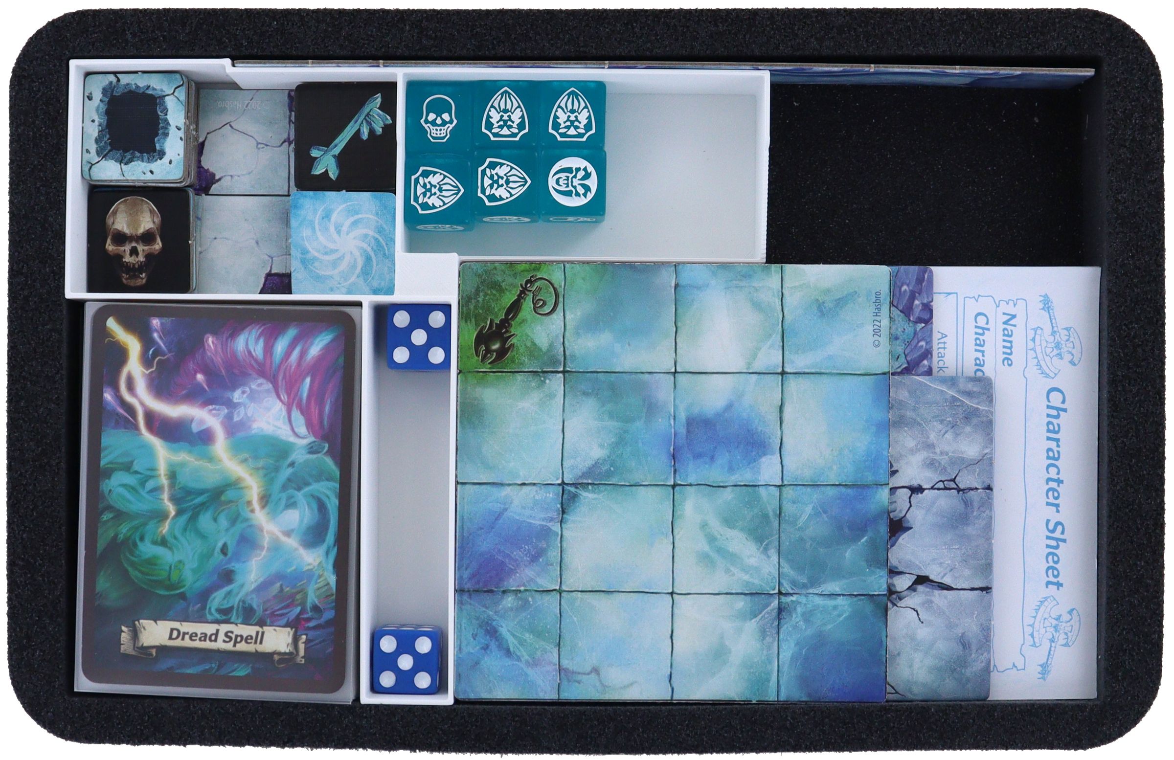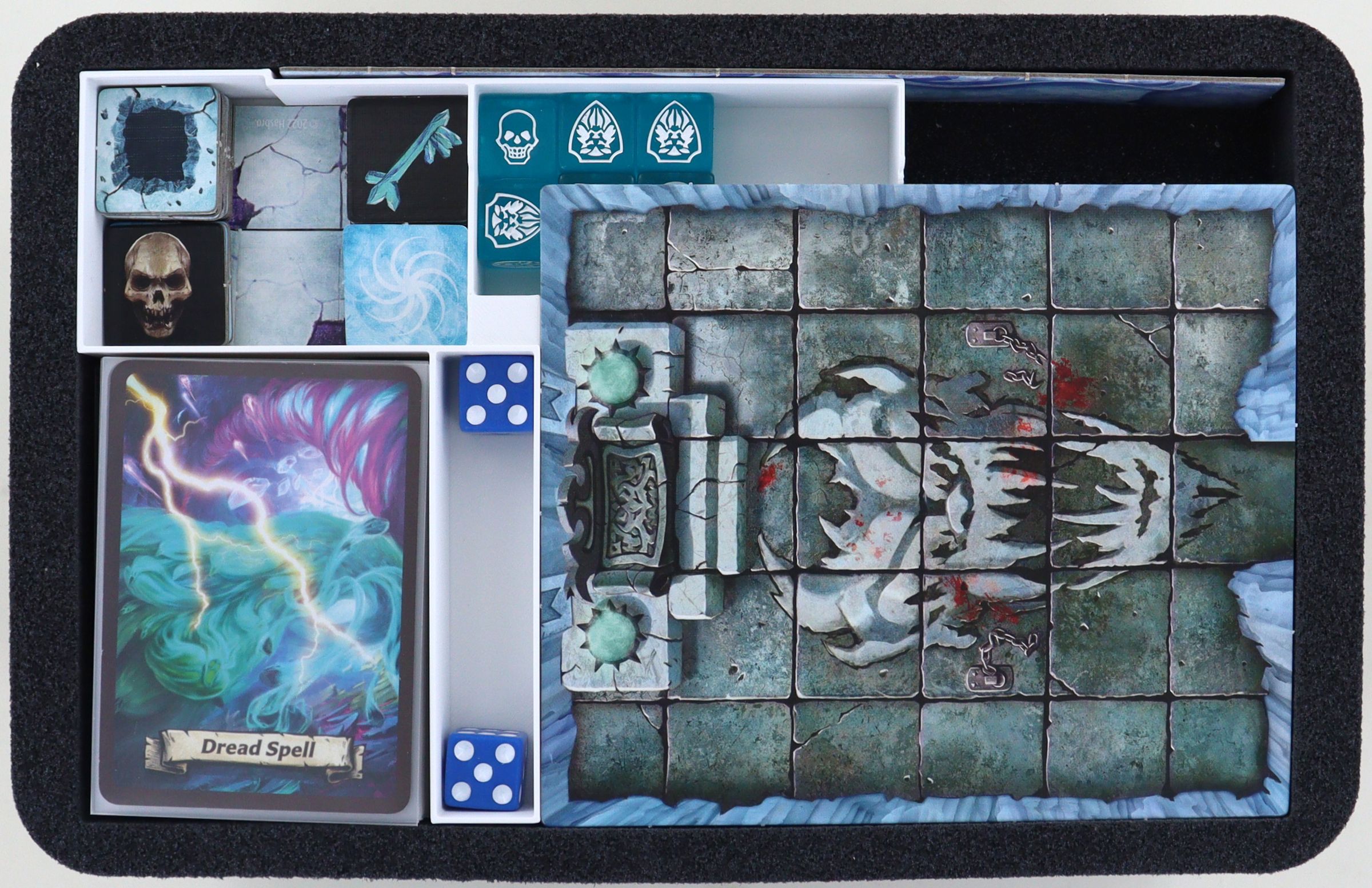 • 1 Plastic card holder with three compartments for small-sized game components like Movement and Combat Dice, as well as tiles like Magic Ice Tiles, Ice Tunnels, Slippery Ice, Ice Vault, Crystal Key Tile, Blocked Square Tiles, and Skull Tiles
