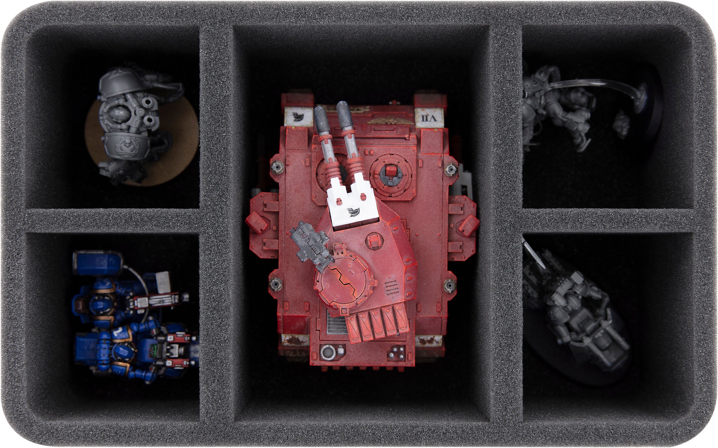 • 1 Half-Size foam tray with 5 compartments for a Space Marine Rhino, Bladeguard Veterans, Primaris Aggressors, Primaris Eradicators (HS090A002)