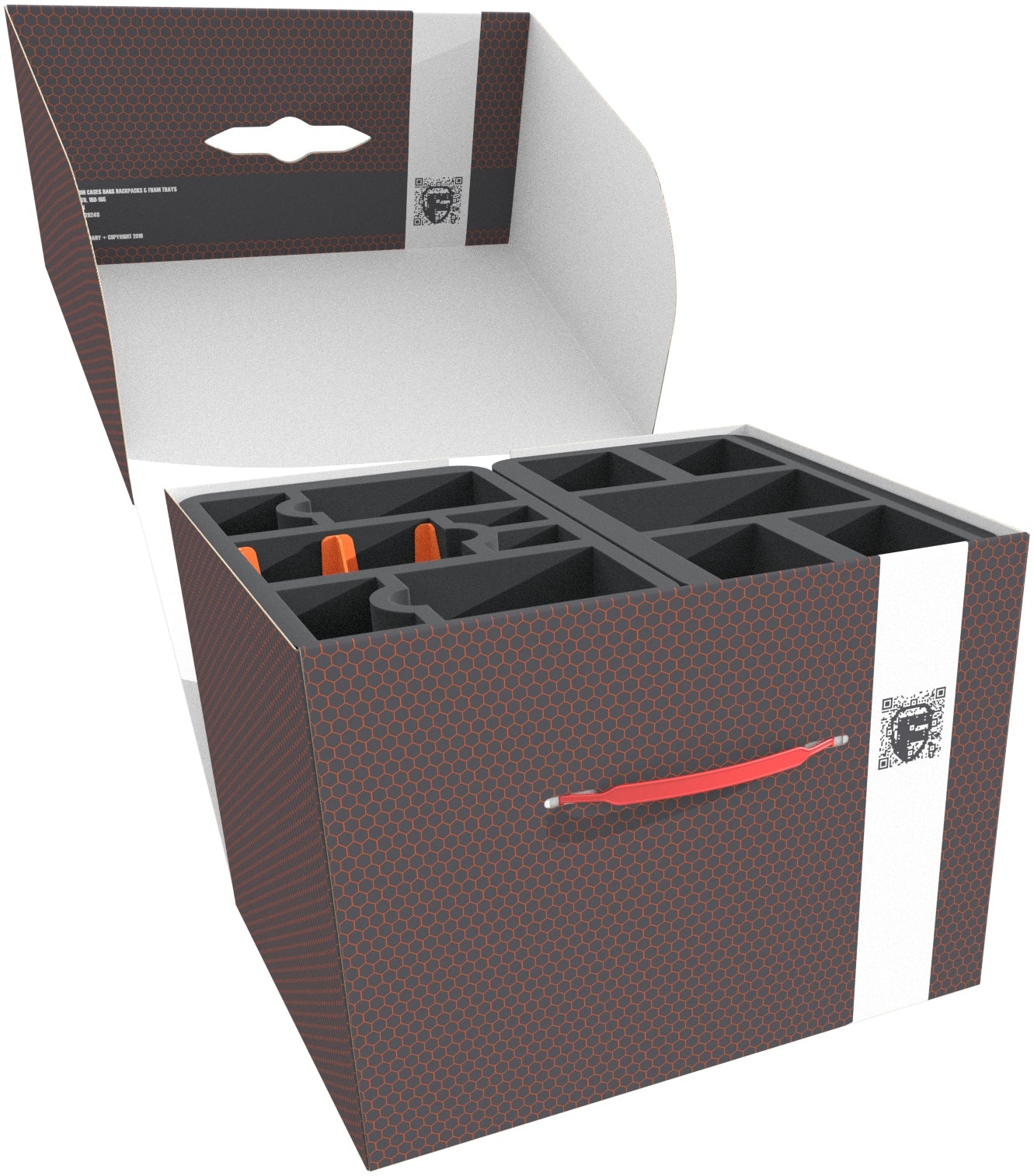 The Storage Box FSLB250 is made of coated, double-walled cardboard. This makes it not only pleasantly light but also particularly tear-resistant and stable. With the matching foam trays, miniatures and game material can be stored safely and dust-protected and transported effortlessly with the plastic carrying handle.
