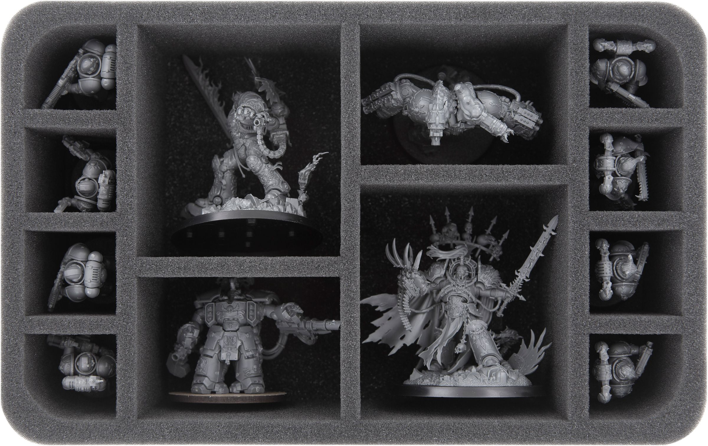 Last but not least, the set contains two trays with 12 differently-sized compartments each. The two large compartments of both trays are ideal for larger miniatures, e. g. the commander of the Black Legion Abaddon the Despoiler. The two medium-sized compartments of each of the trays are suitable for e. g. Obliterators. The eight small compartments of each of the two trays are perfect for standard warriors of the Heretic Astartes legion.