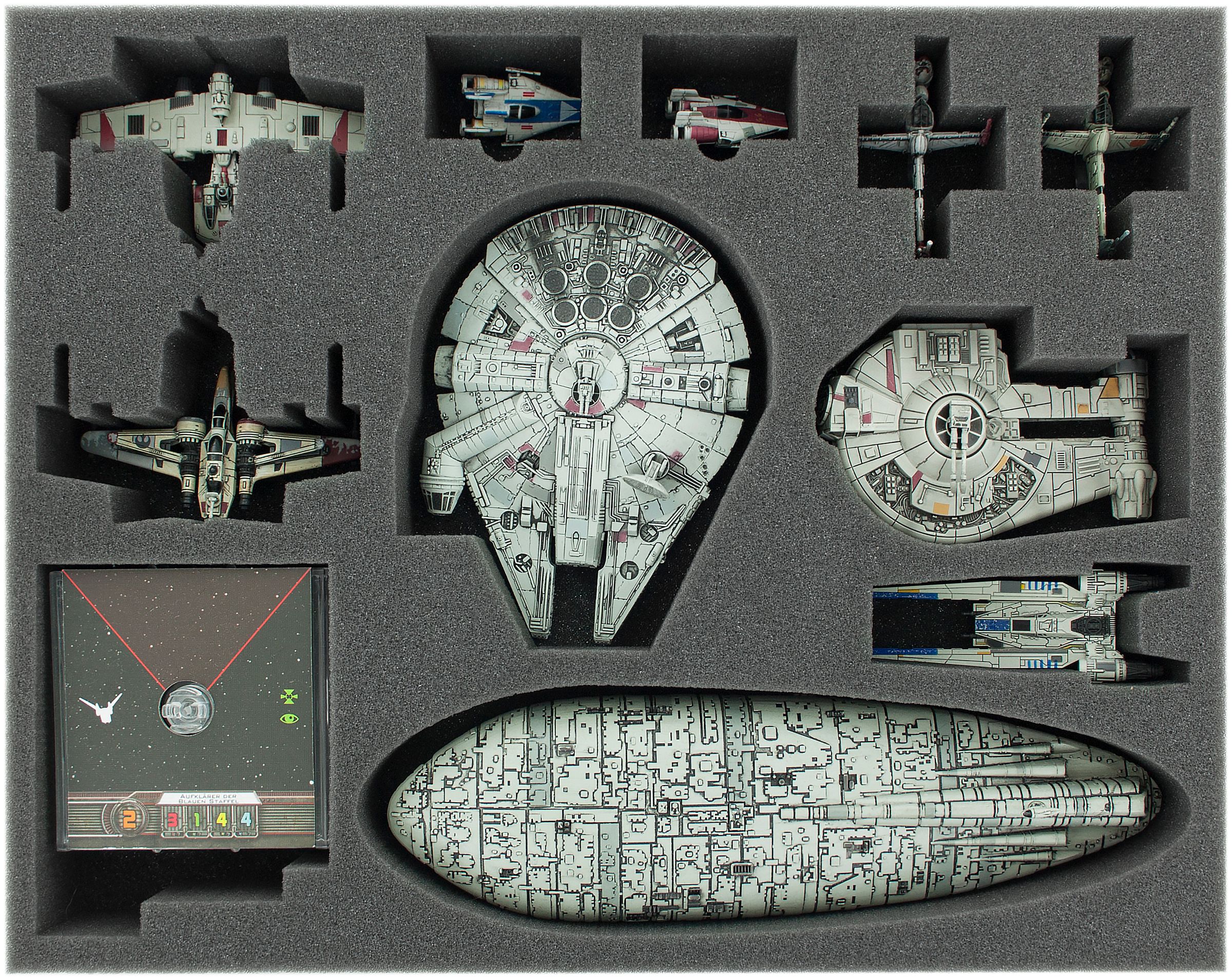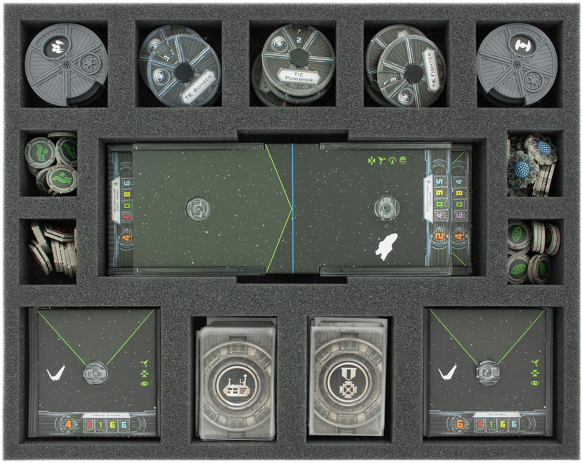 The large Feldherr storage box for stowing and transporting your ships. The box is filled with a total of four custom foam inserts, both for the Imperial ships and for the Rebels from the Star Wars X-Wing Waves 1 to 10. In addition, the package contains an insert for stowing tokens, bases and other accessories.
