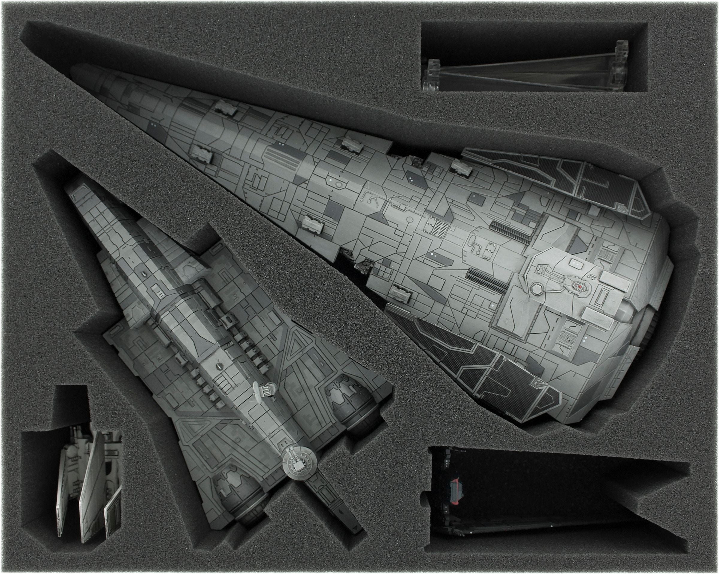 The specially designed foam tray for the Imperial Storm Corvette, the Imperial Attack Carrier, and Lambda-class and Upsilon-class Shuttles features: