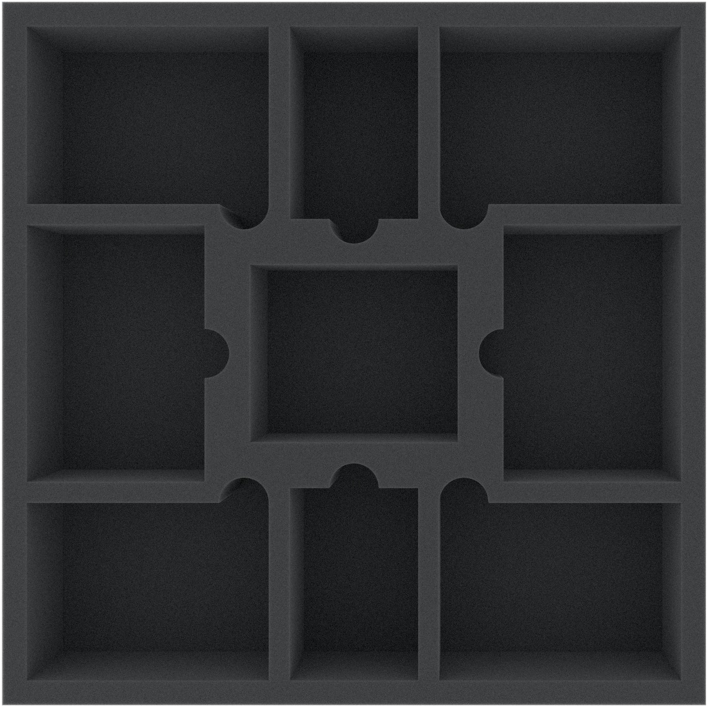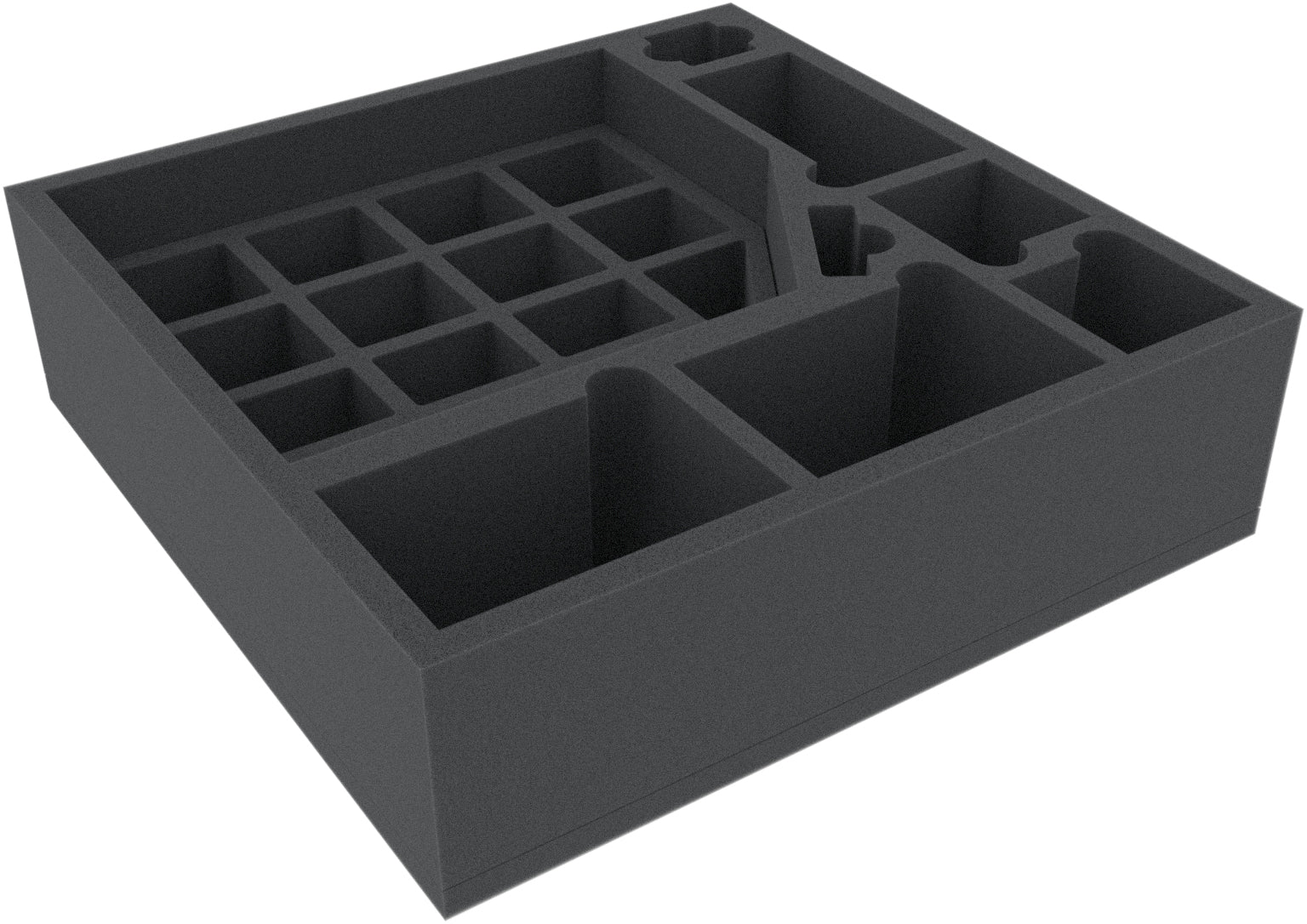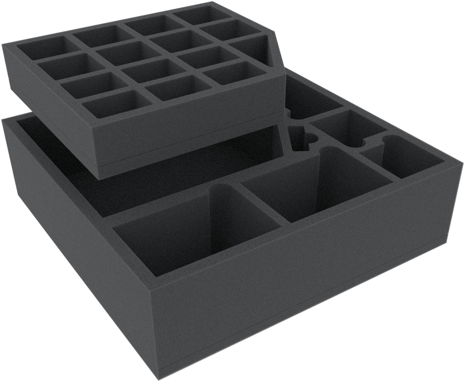 The two 80 mm high foam trays are divided into a large compartment for the foam insert and seven additional compartments for storing the game components.