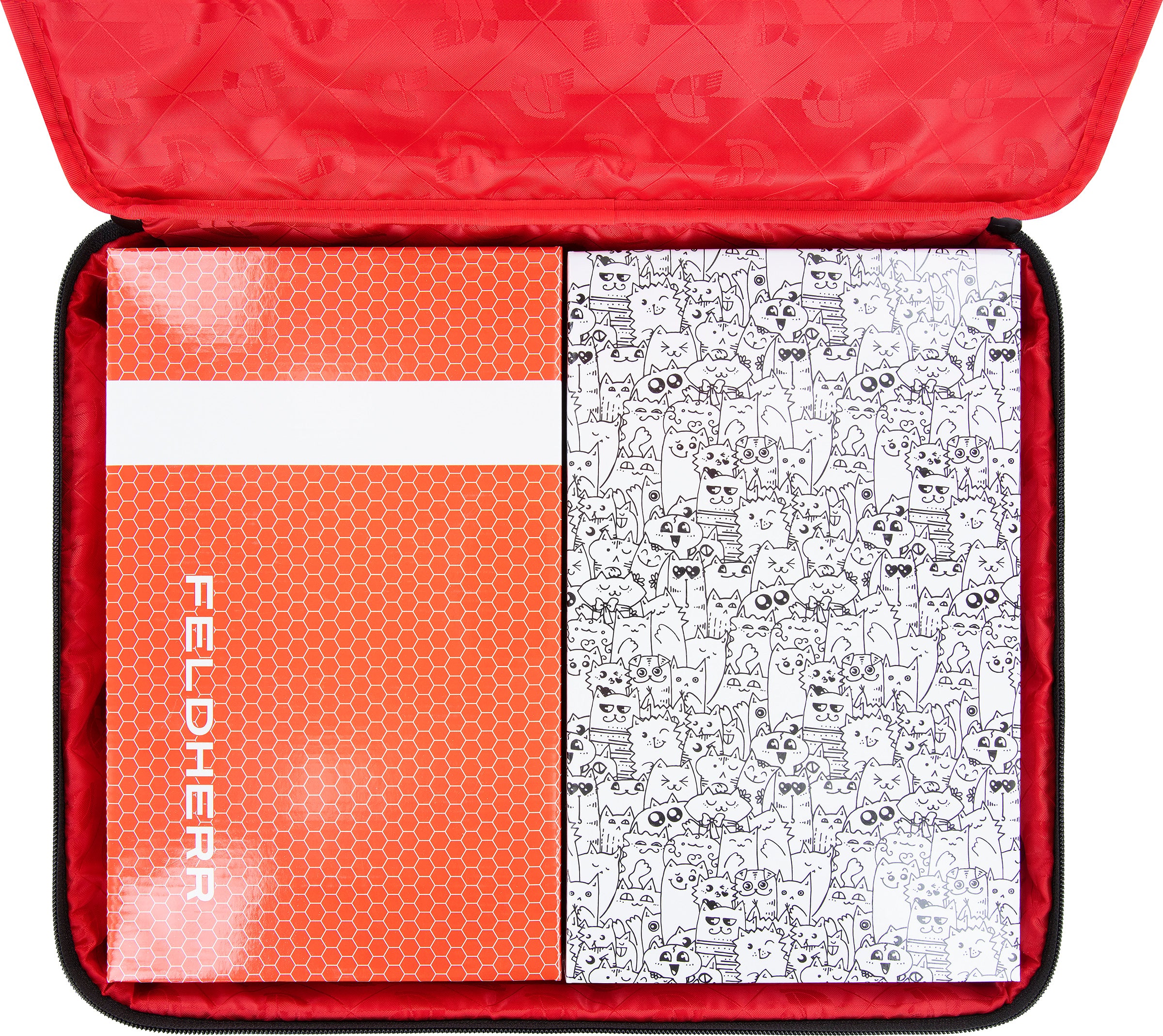 The Storage Box consists of two parts, a box, and a lid. Both parts are made of coated cardboard. A partition in the middle of the box divides it into two equally sized compartments. The slip-on cover protects the cards from dust and other external influences.