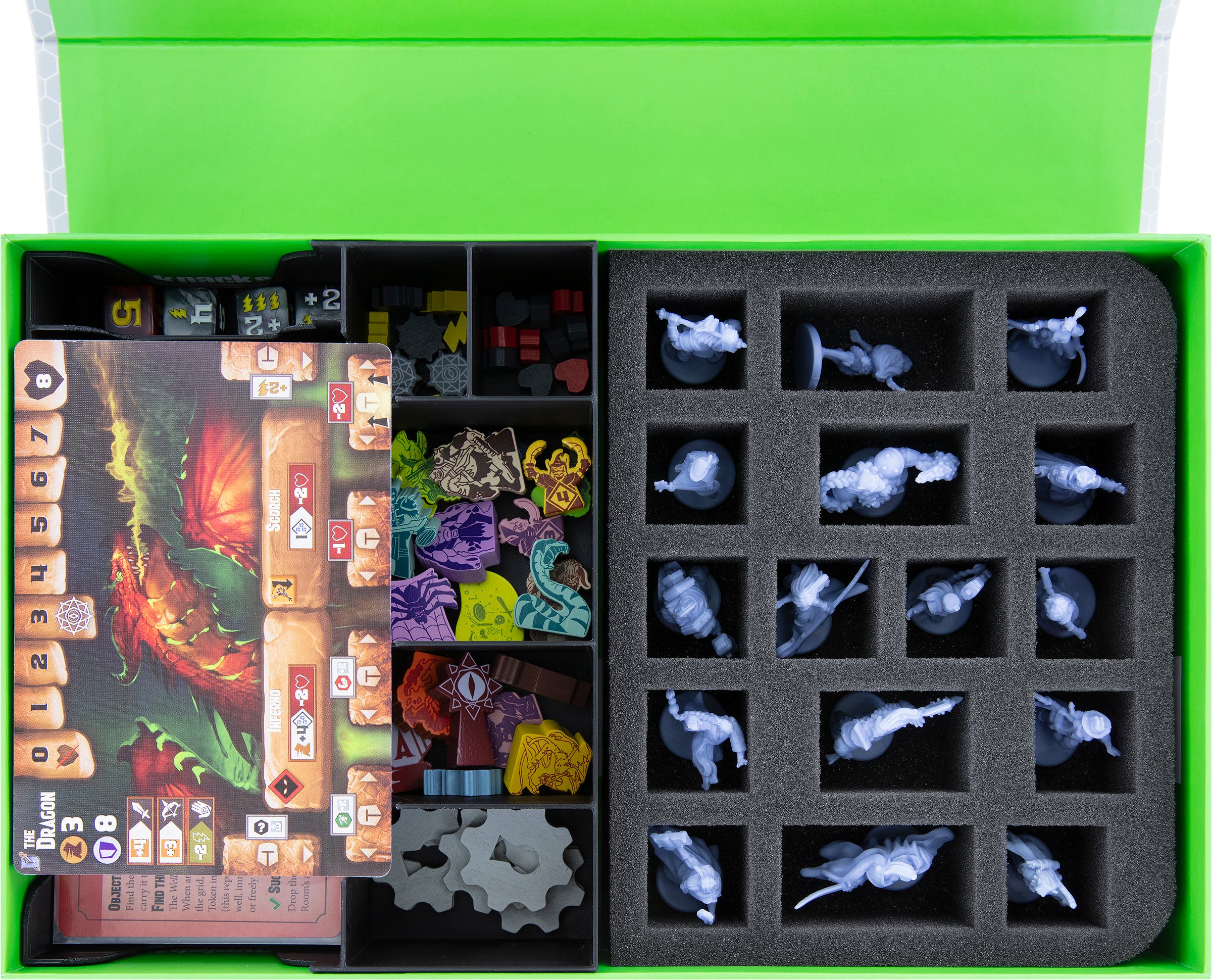 • All the contents of the "Tiny Epic: Dungeons" core game and the two expansions "Potions & Perils" and "Stories" fit into the Feldherr Magnetic Box green HSMB055 including custom foam tray and plastic insert.
