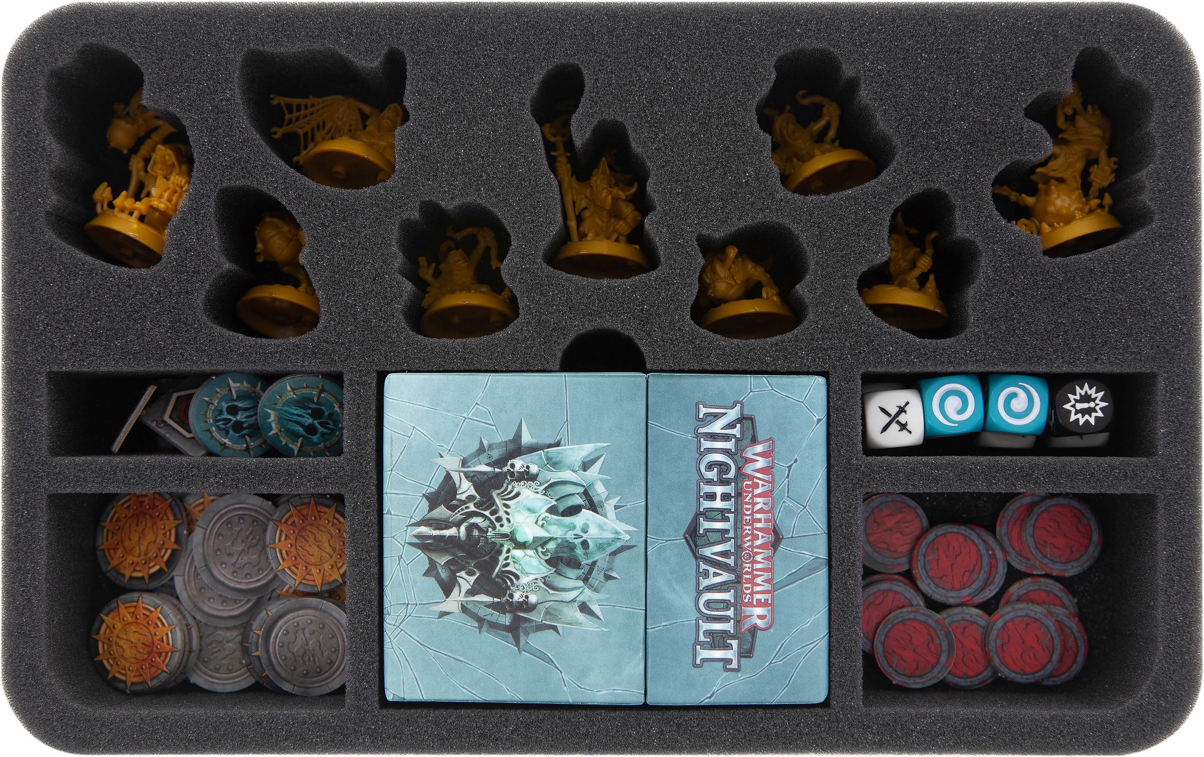 A total of 14 compartments will help you keep track of the tripping goblin crowd and the game material. Zarbag, Snirk Sourtongue, Prog Da Netter, Stikkit, RedKap, Dibbz, Drizgit Da Squig Herder, Bonekrakka and Gobbaluk are safely stored in compartments cut precisely for each individual miniature.